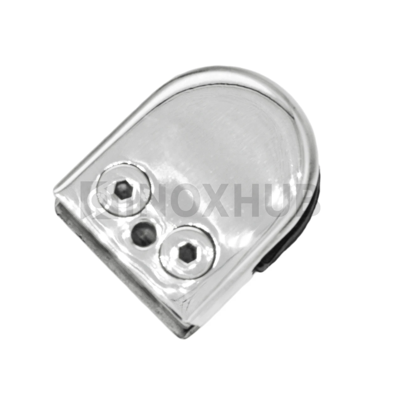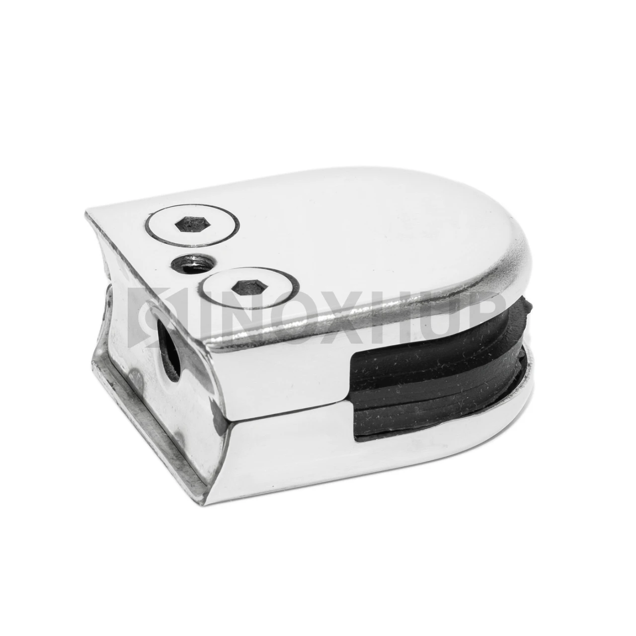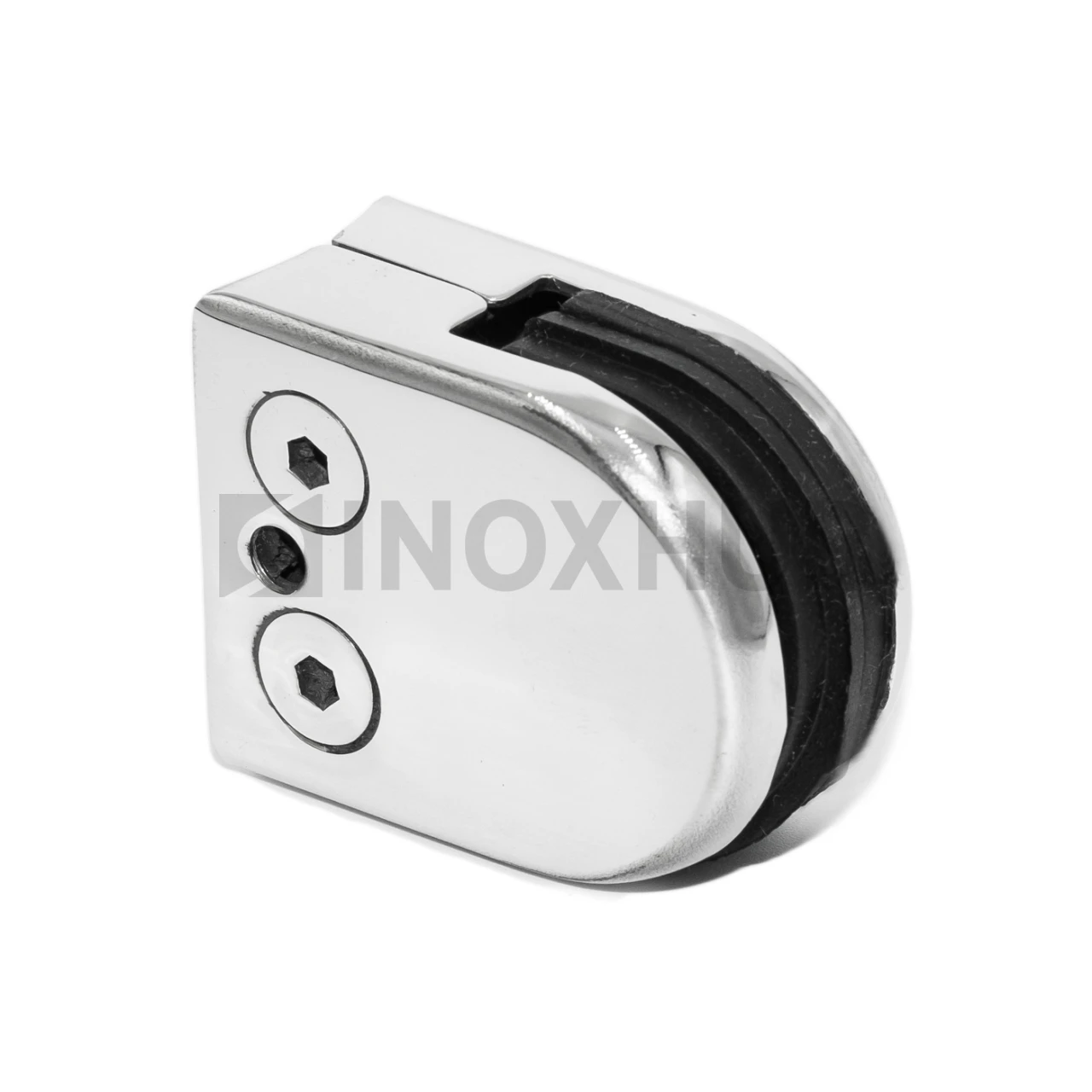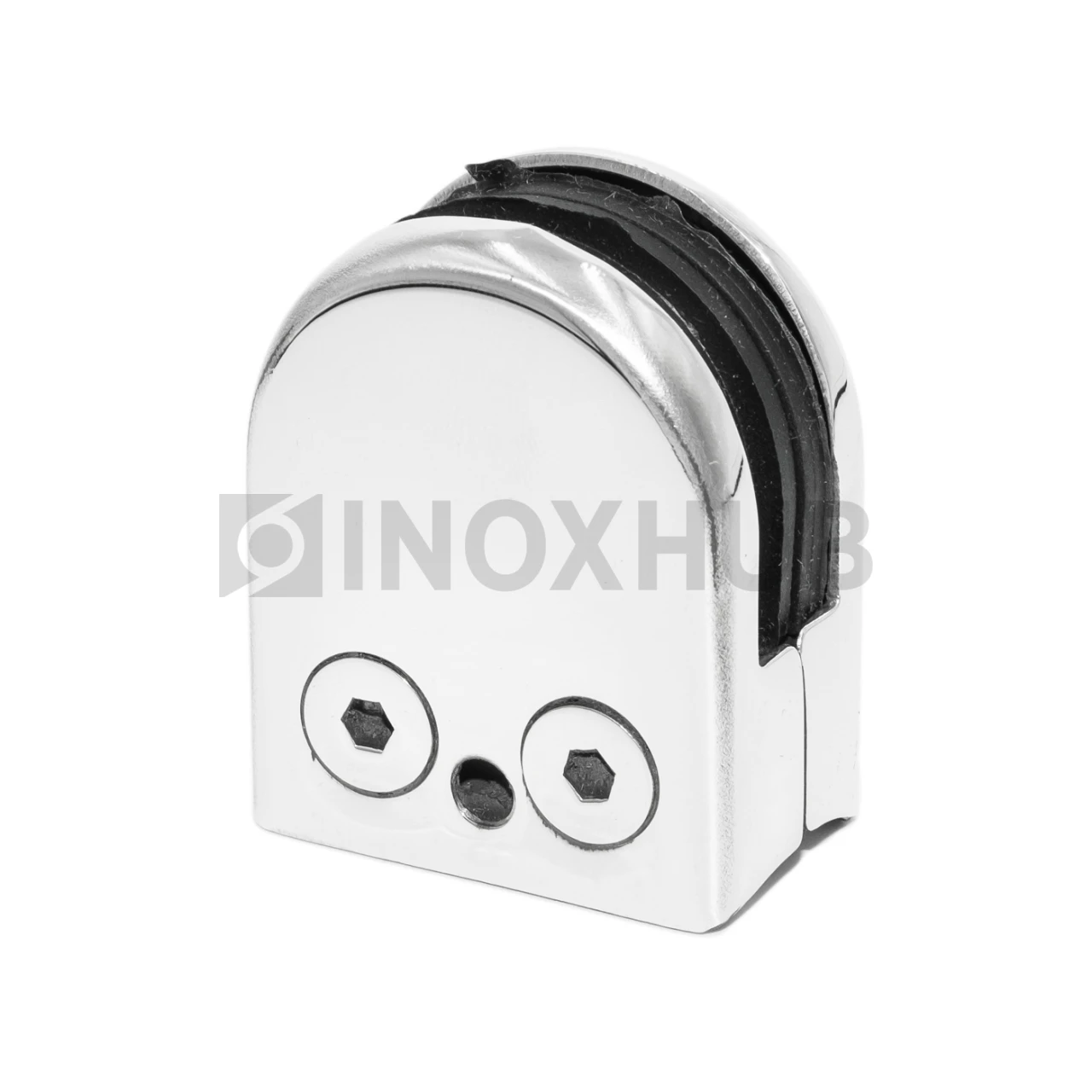 Штампованный стеклодержатель выполнен из стали AISI 201, из-за чего его можно использовать только в помещении. Имеет полированную поверхность GRIT 600. Форма — полукруглая.
