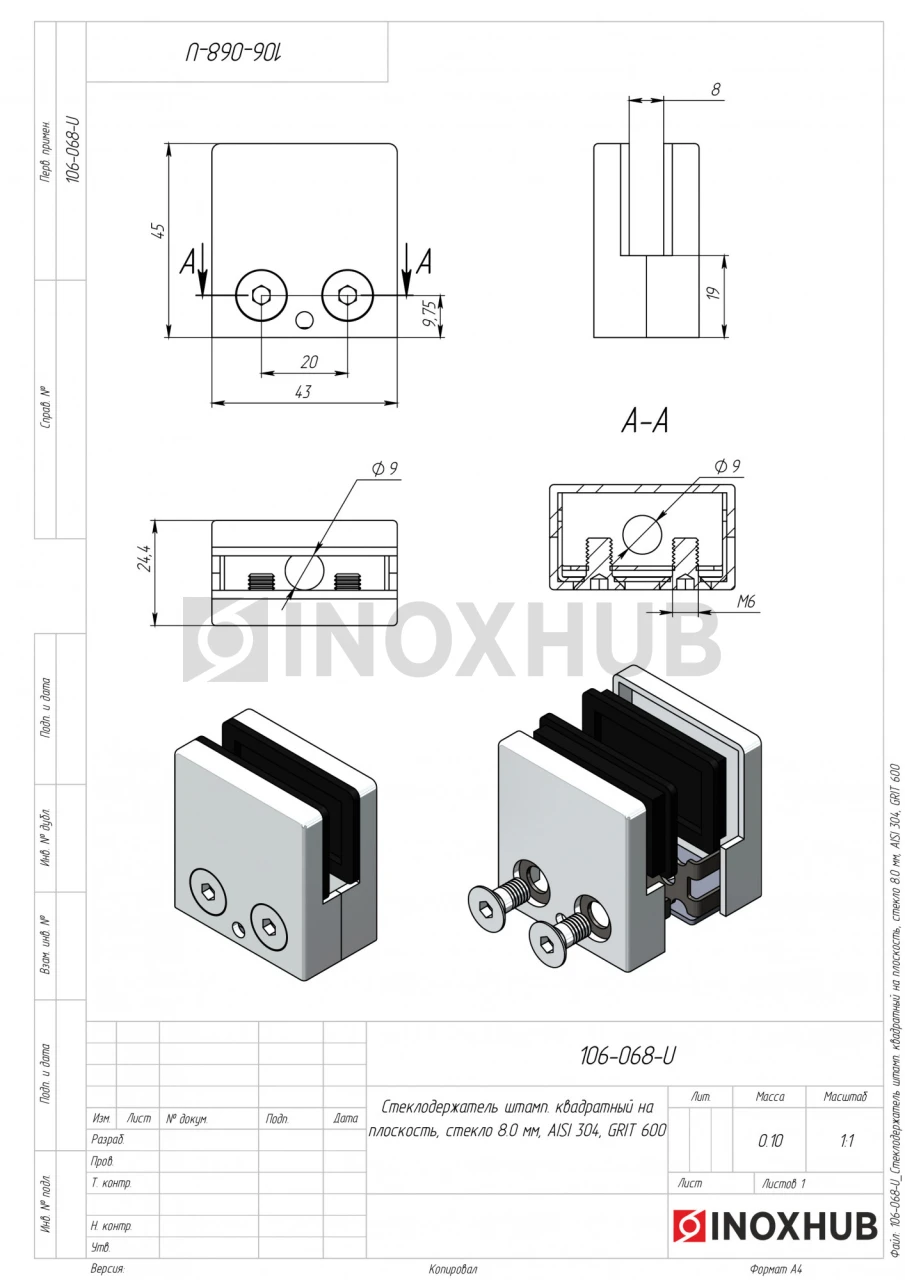 Стеклодержатель штамп. квадратный на плоскость, стекло 8.0 мм, AISI 304, GRIT 600