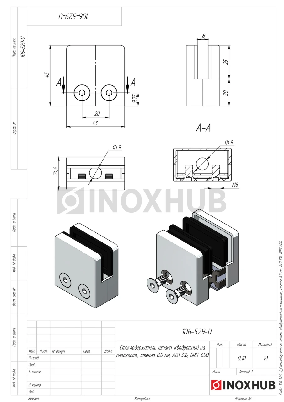 Квадратный стеклодержатель под плоскость и стекло толщиной 8 мм. Корпус крепления полированный (поверхность GRIT 600), стильно смотрится в любом интерьере. Размер изделия (ДхШхВ) — 43х24,4х45 мм. Марка стали — AISI 316, деталь можно эксплуатировать в уличных условиях, вблизи водоемов, бассейнов, в других агрессивных средах.