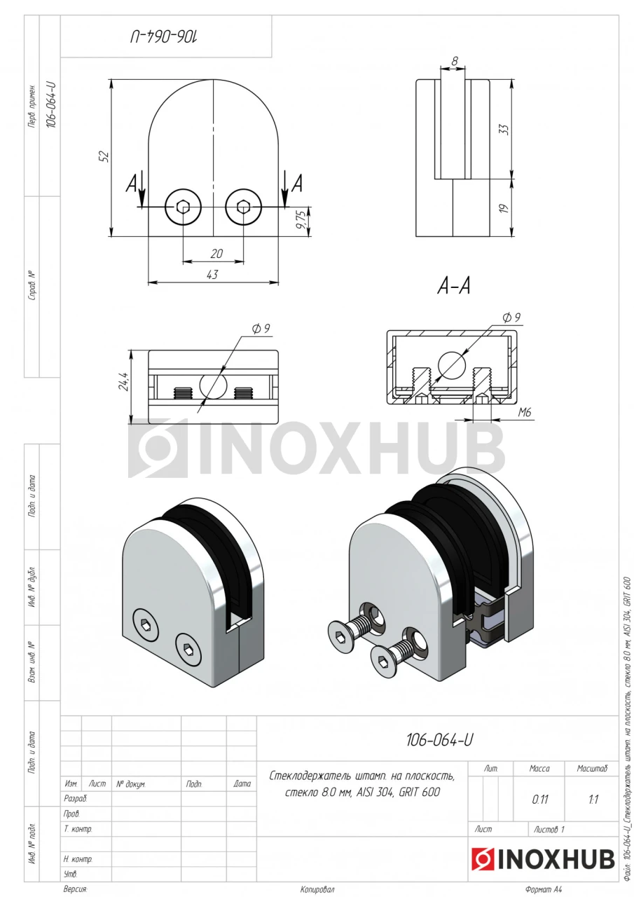 Штампованный стеклодержатель. Выполнен из стали AISI 304, имеет полированную поверхность GRIT 600. Основание детали рассчитано под плоскость.
