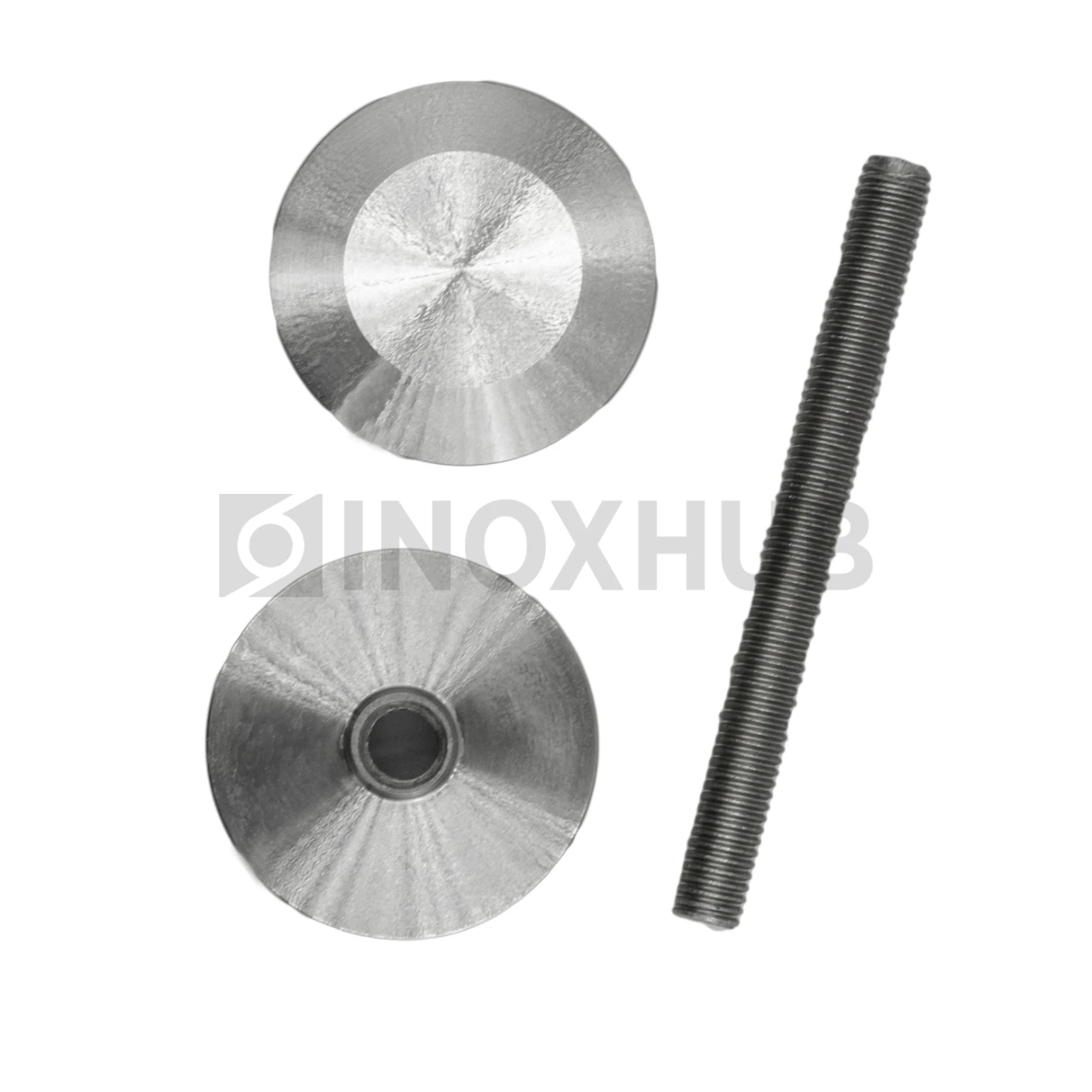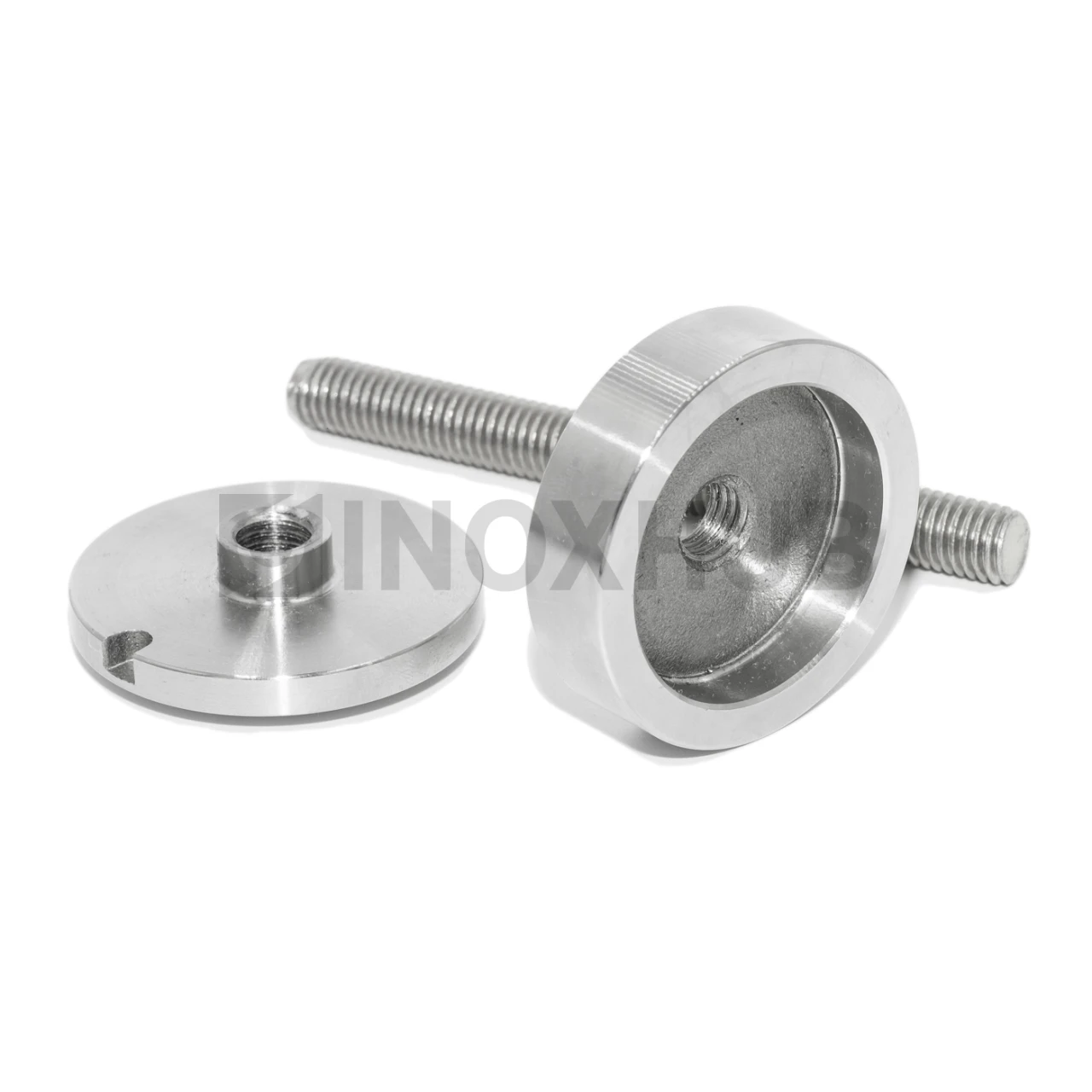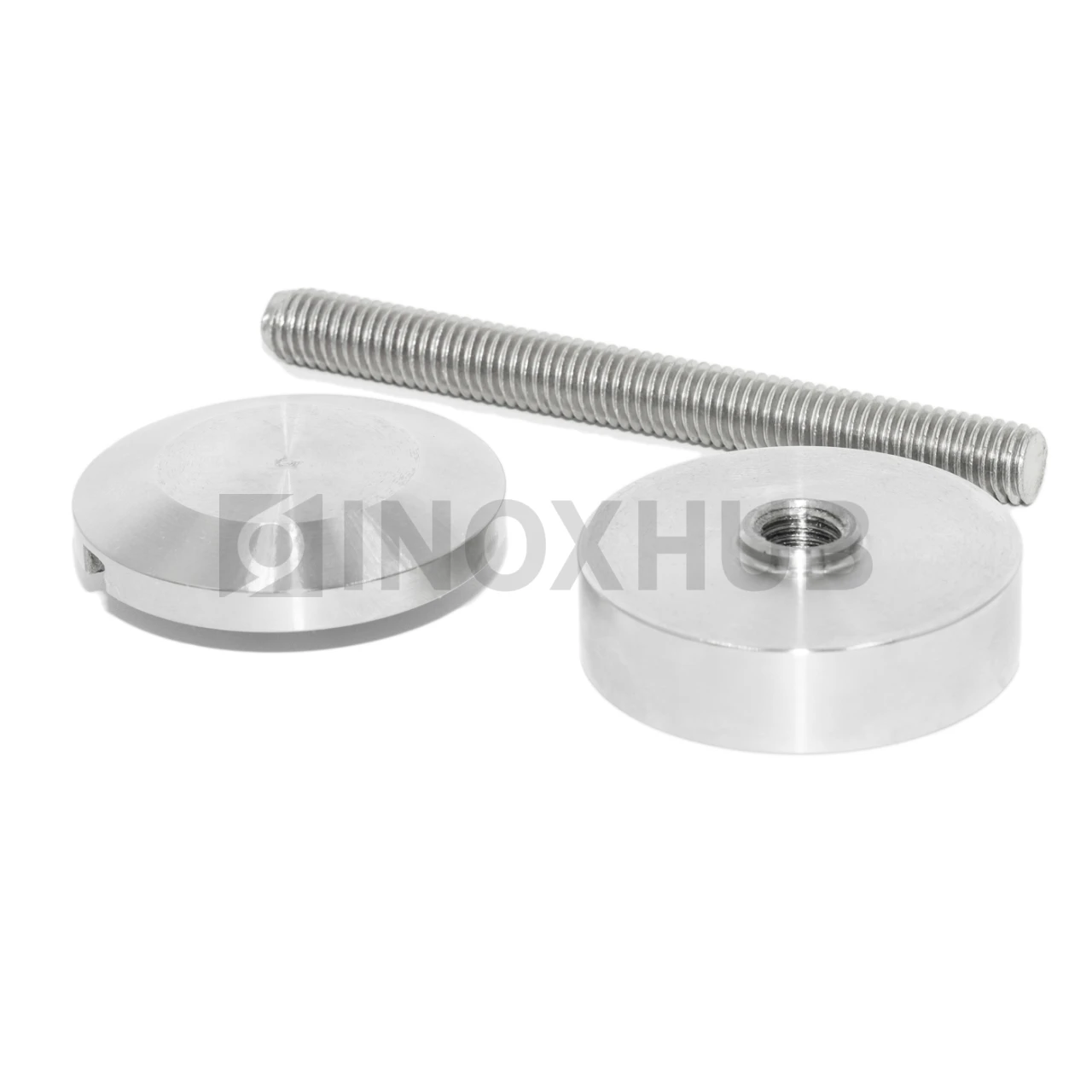 Точечный стеклодержатель с размером шпильки М10 подходит для стекол толщиной 6-30 мм. Шайбы изготовлены из стали марки AISI 304, поэтому деталь можно эксплуатировать на улице. Длинная оцинкованная шпилька выдерживает большую массу стекла. Длина шпильки — 200 мм, диаметр шайб — 50 мм. Поверхность шлифованная GRIT 320.