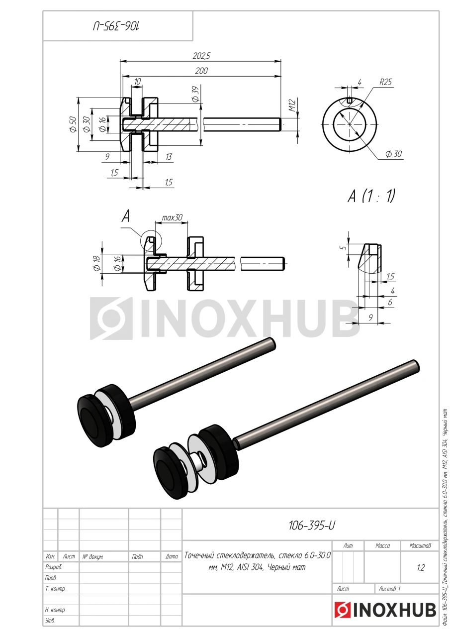 Точечный стеклодержатель, стекло 6.0-30.0 мм, М12, AISI 304, Черный мат
