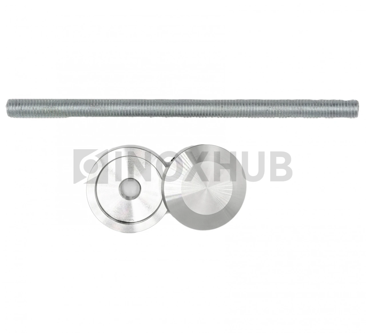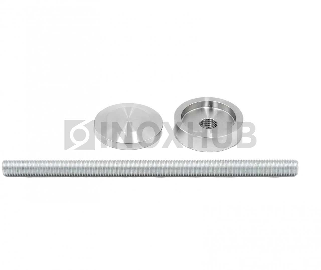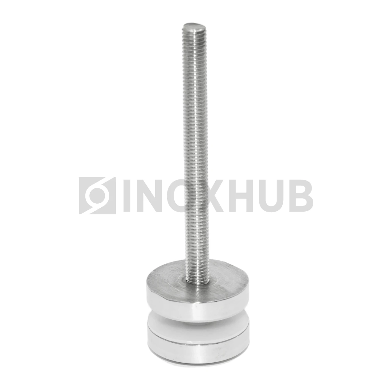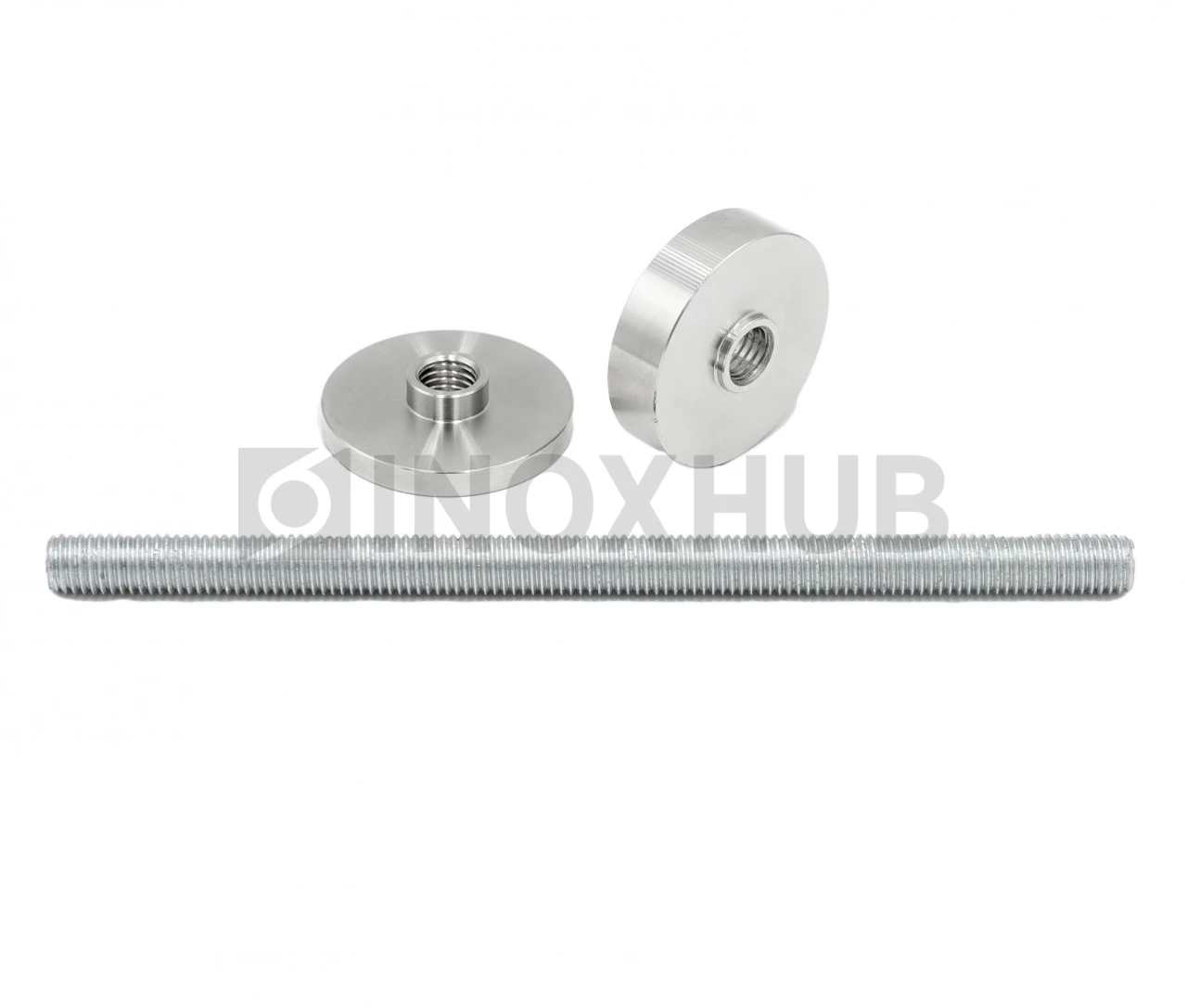 Точечный стеклодержатель размером шпильки М12 подходит для стекол толщиной 6-30 мм. Шайбы изготовлены из стали марки AISI 304, поэтому деталь можно эксплуатировать на улице. Длинная оцинкованная шпилька выдерживает большую массу стекла. Длина шпильки — 200 мм, диаметр шайб — 50 мм. Поверхность шлифованная GRIT 320.