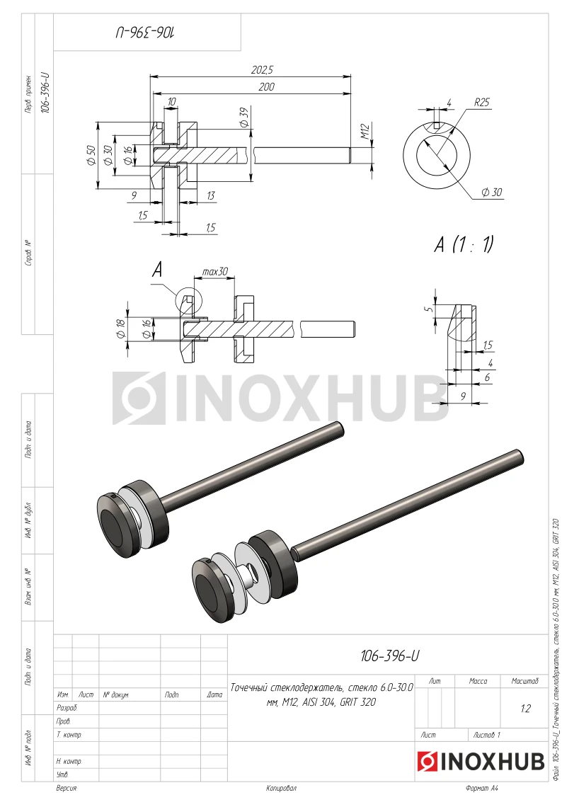 Точечный стеклодержатель, стекло 6.0-30.0 мм, М12, AISI 304, GRIT 320