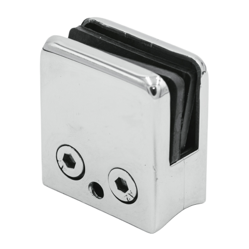 Зажимной стеклодержатель — это простое и надежное крепление для стеклянных конструкций. Он фиксирует стекло без сверления, что сохраняет его целостность. Особенно важно для закаленного и многослойного стекла.