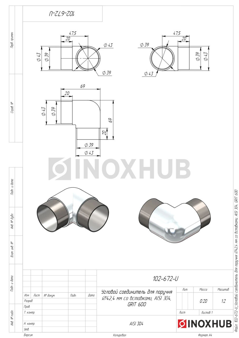 Угловой соединитель со вставками, Ø42.4 мм, AISI 304, GRIT 600
