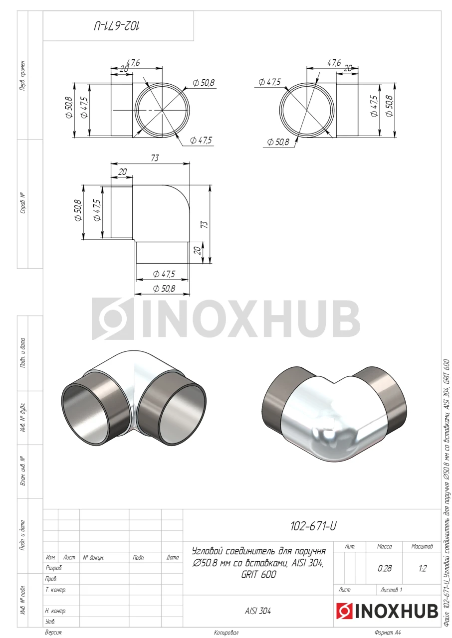 Угловой соединитель с предусмотренными вставками. Выполнен из стали AISI 304. Имеет полированную поверхность GRIT 600.