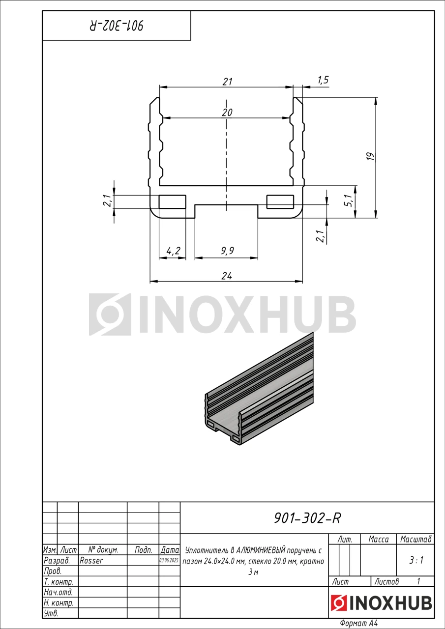 Уплотнитель в АЛЮМИНИЕВЫЙ поручень с пазом 24.0×24.0 мм, стекло 20.0 мм, кратно 3 м