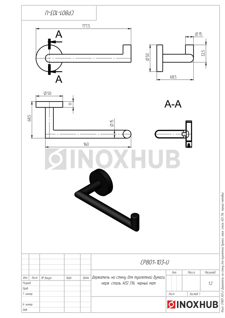 Держатель на стену для туалетной бумаги, нерж. сталь AISI 316, черный матовый