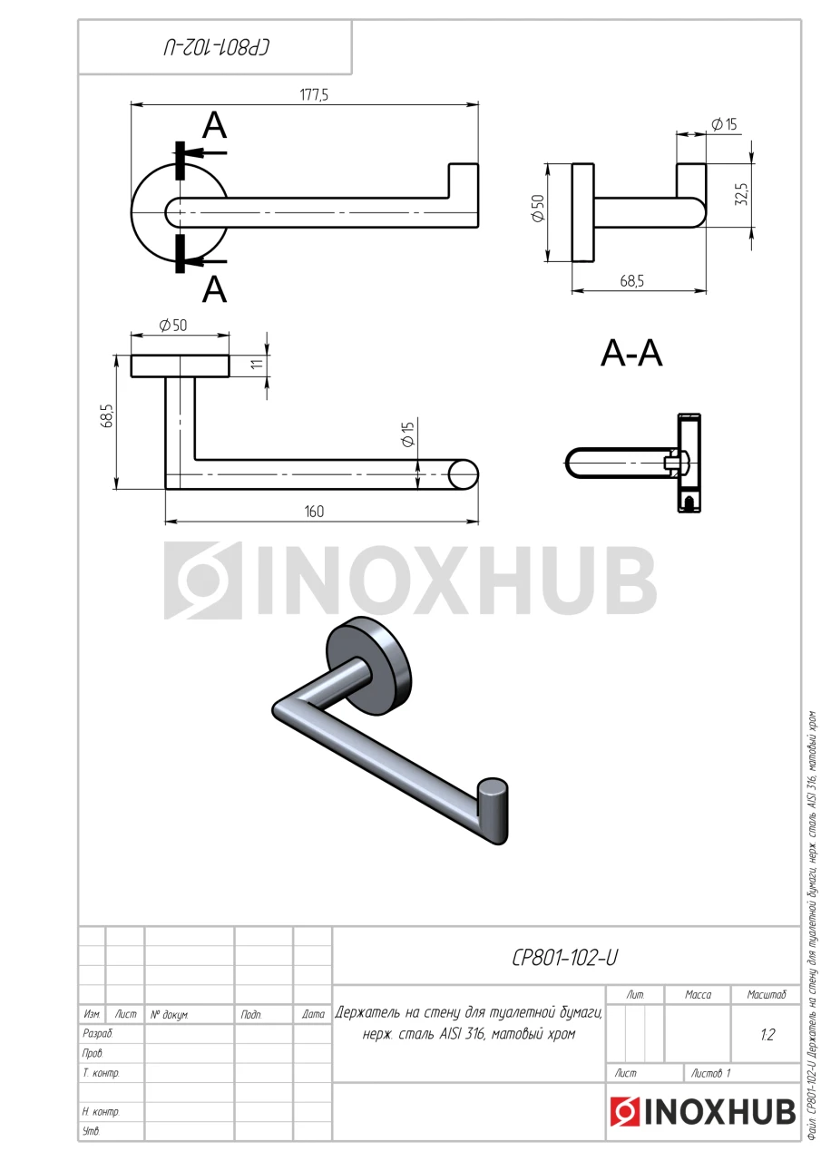 Держатель на стену для туалетной бумаги, нерж. сталь AISI 316, матовый хром