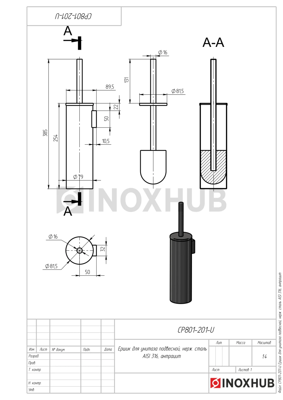Ершик для унитаза подвесной, нерж. сталь AISI 316, антрацит