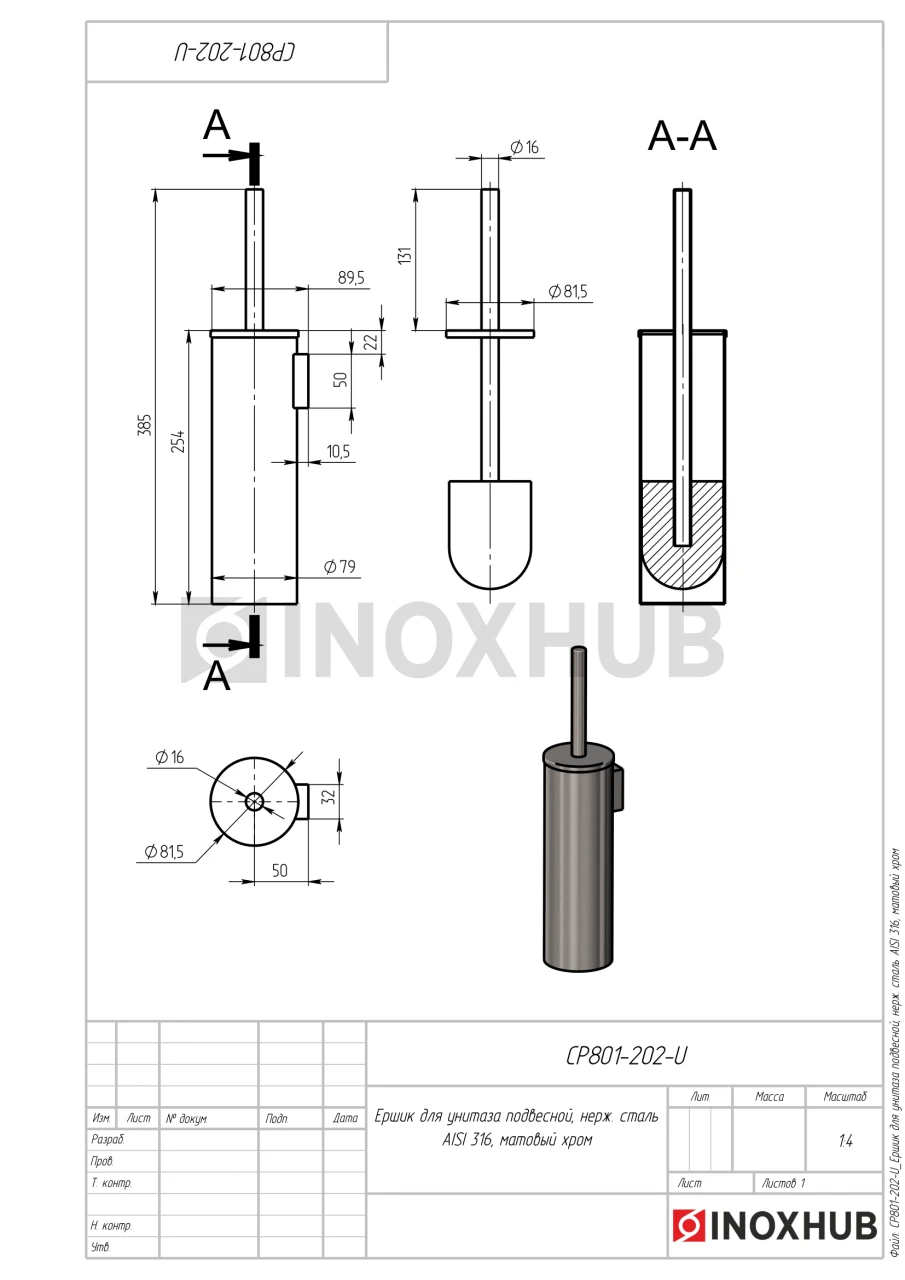 Ершик для унитаза подвесной, нерж. сталь AISI 316, матовый хром