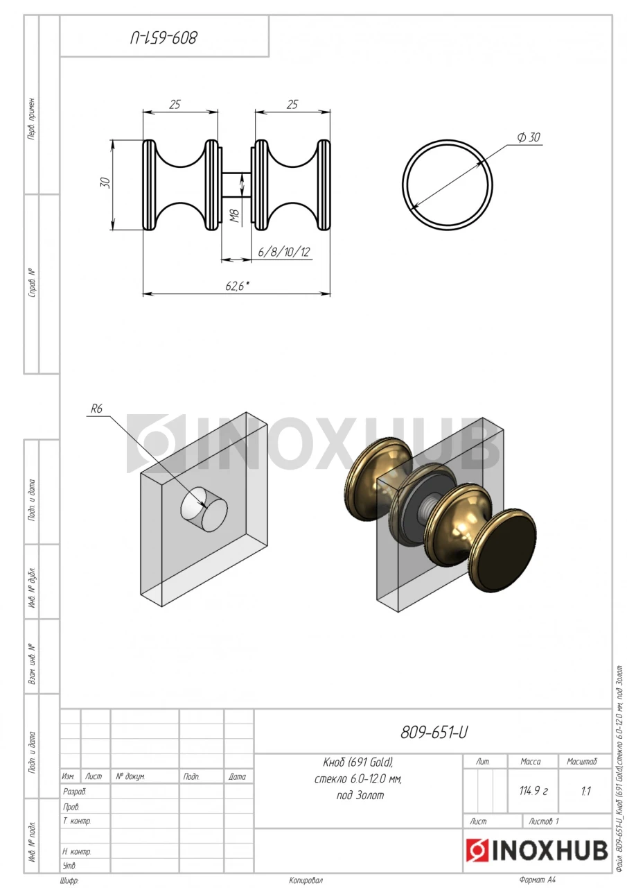 Кноб (691 Gold), стекло 6.0-12.0 мм, под Золото