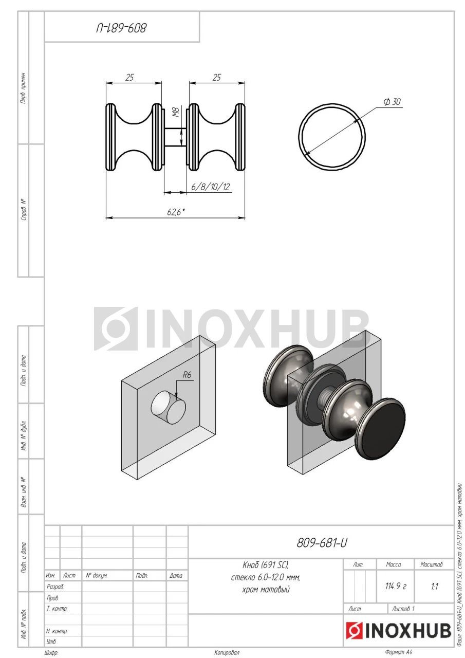 Кноб (691 SC), стекло 6.0-12.0 мм, хром матовый