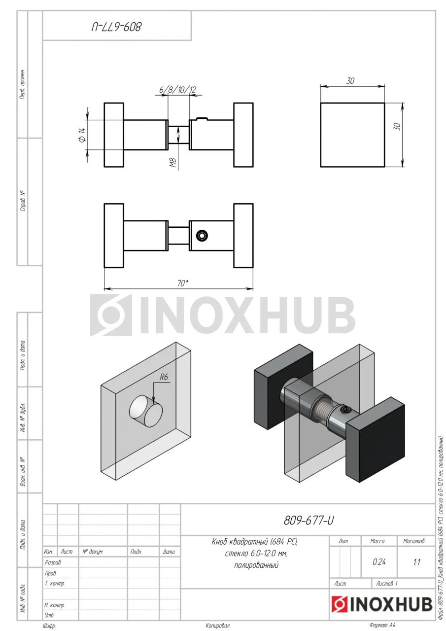 Кноб квадратный (684 PC), стекло 6.0-12.0 мм, полированный