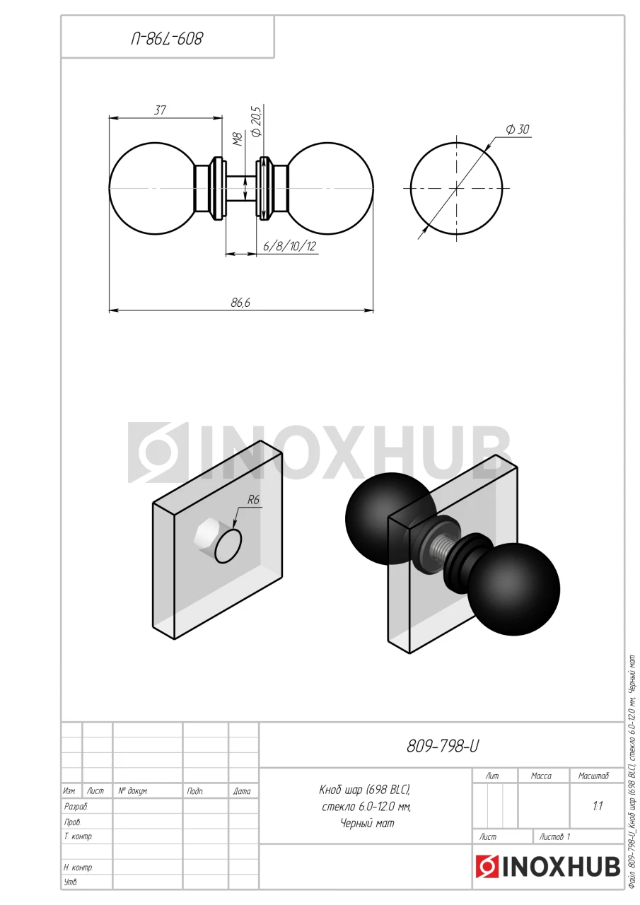 Кноб шар (698 BLC), стекло 6.0-12.0 мм, Черный мат
