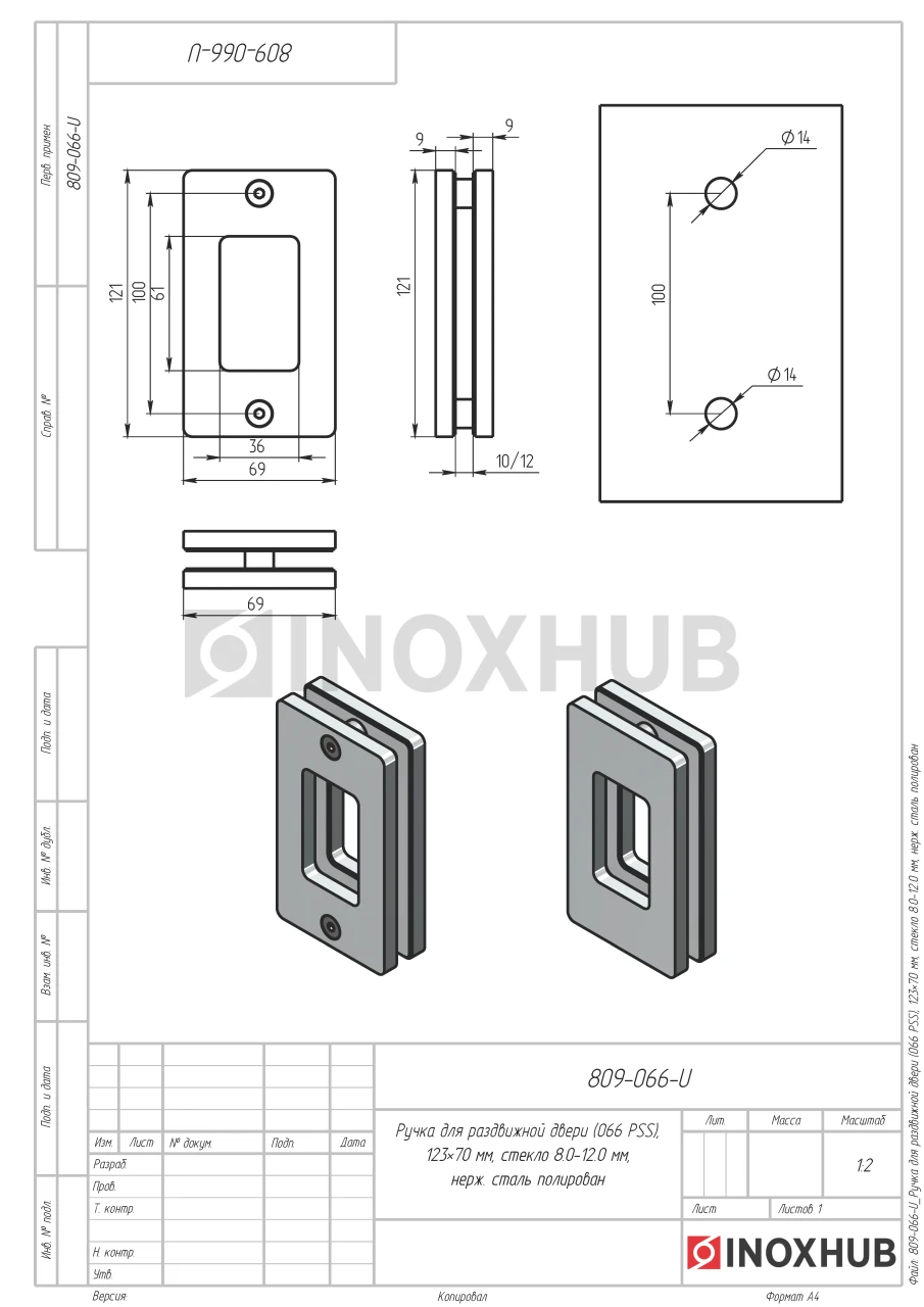 Ручка для раздвижной двери (066 PSS), 123×70 мм, стекло 8.0-12.0 мм, нерж. сталь полированная