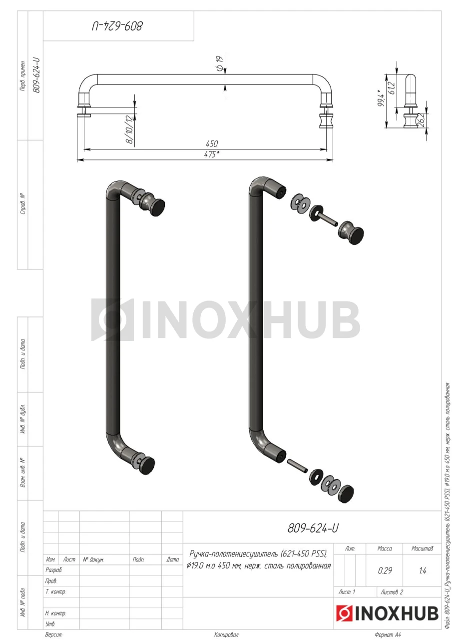 Ручка-полотенцесушитель (621-450 PSS), Ø19.0 м/о 450 мм, нерж. сталь полированная