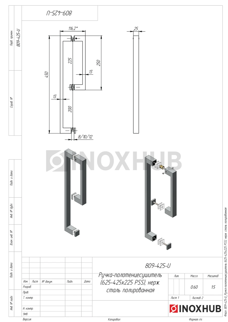 Ручка-полотенцесушитель (625-425х225 PSS), 25х13 425х225, нерж. сталь полированная