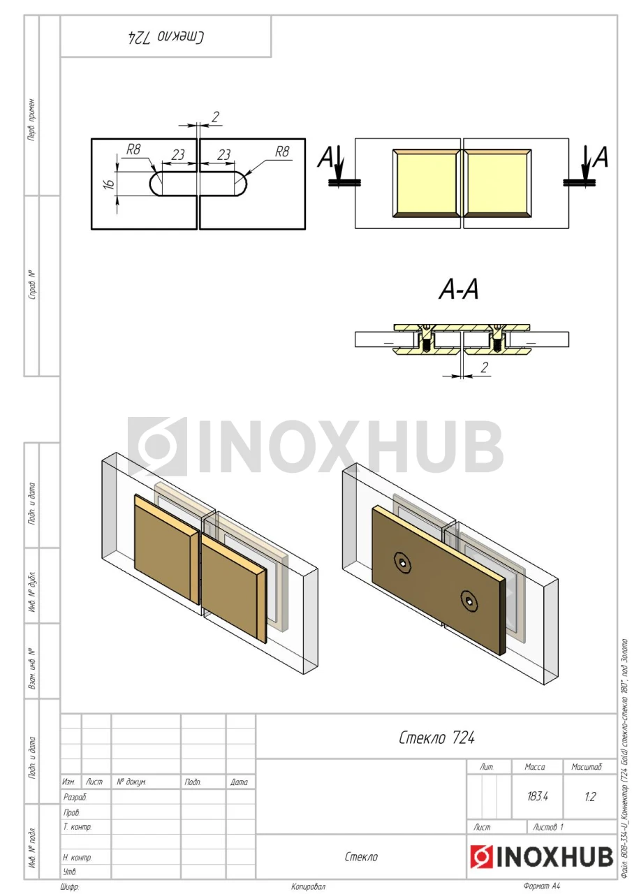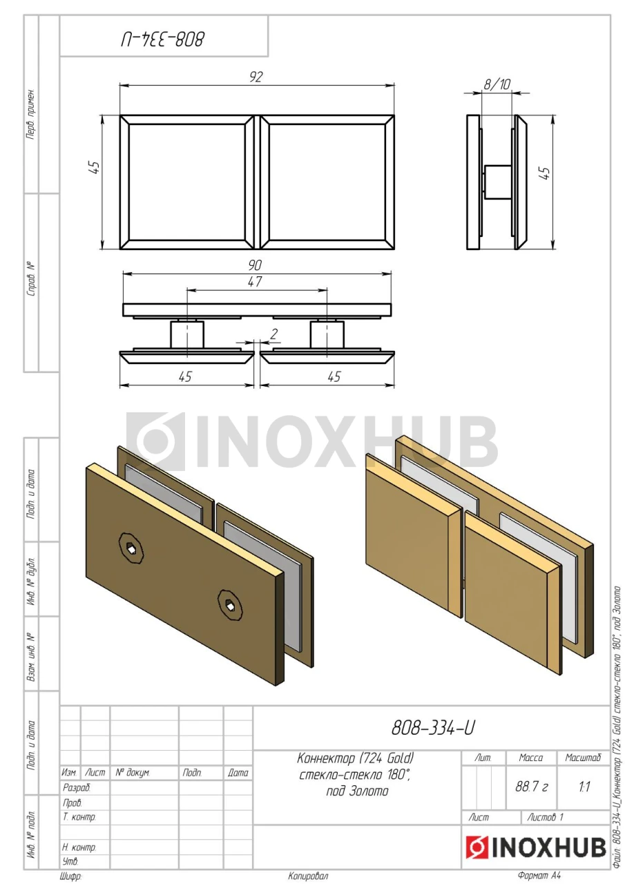 Коннектор (724 Gold) стекло-стекло 180°, под Золото