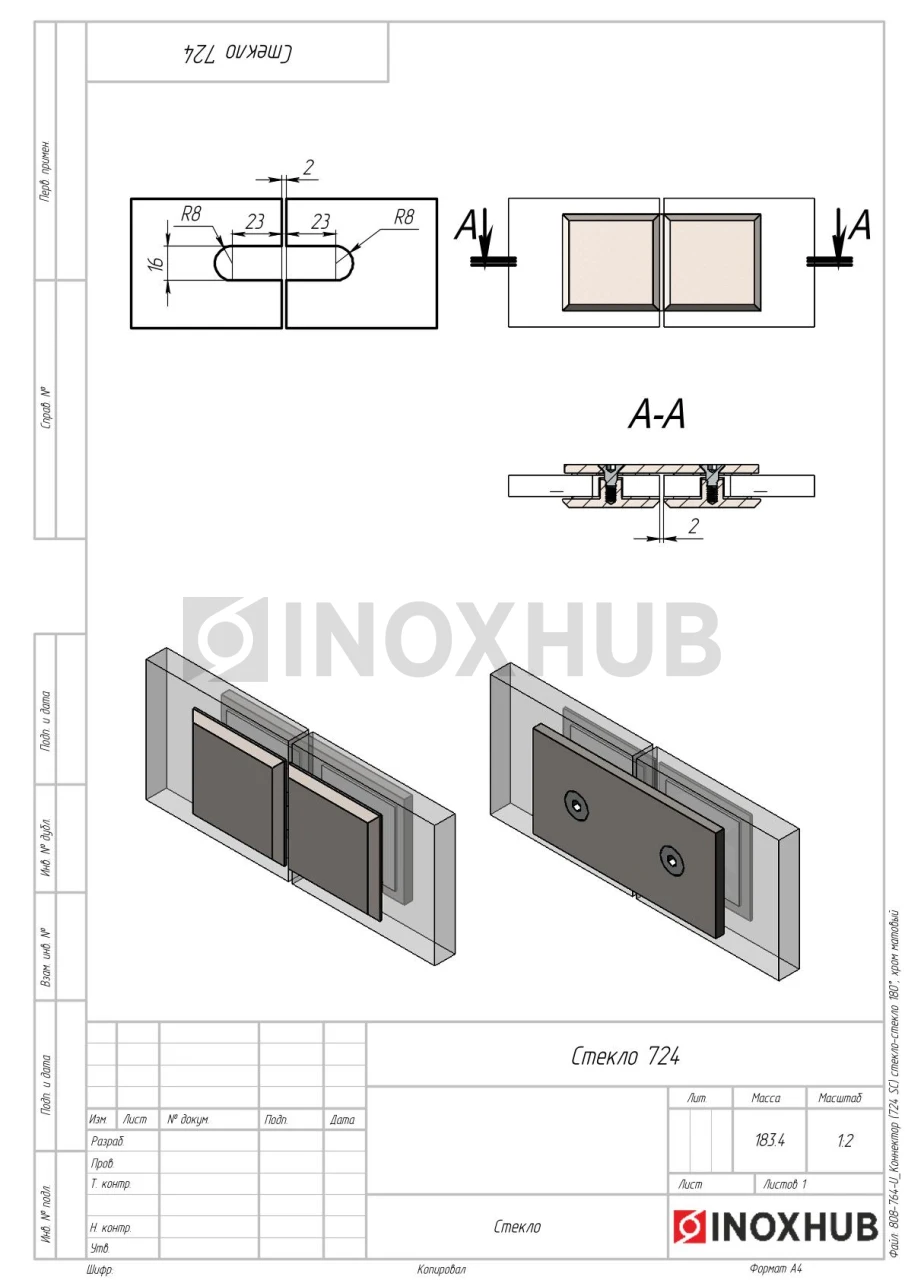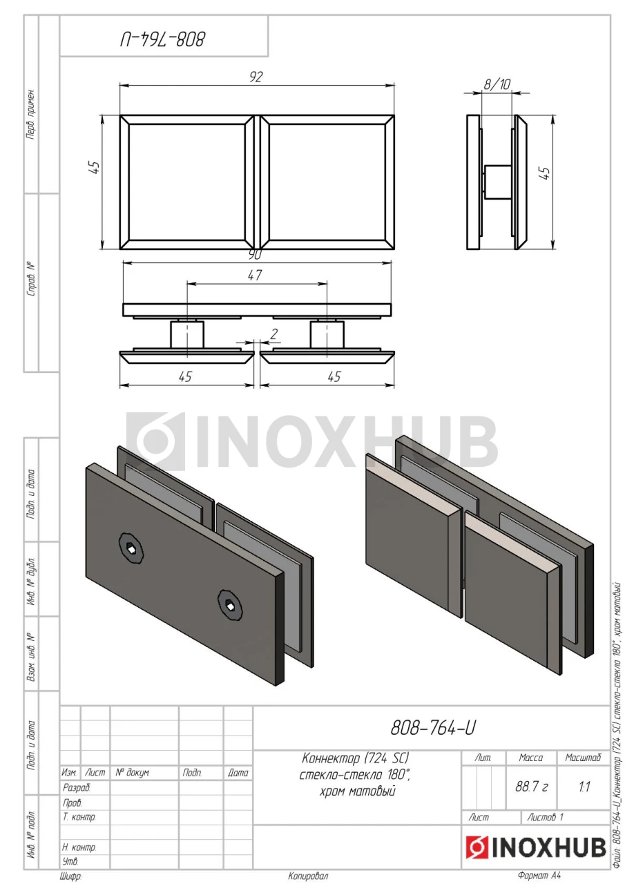 Коннектор (724 SC) стекло-стекло 180°, матовый хром
