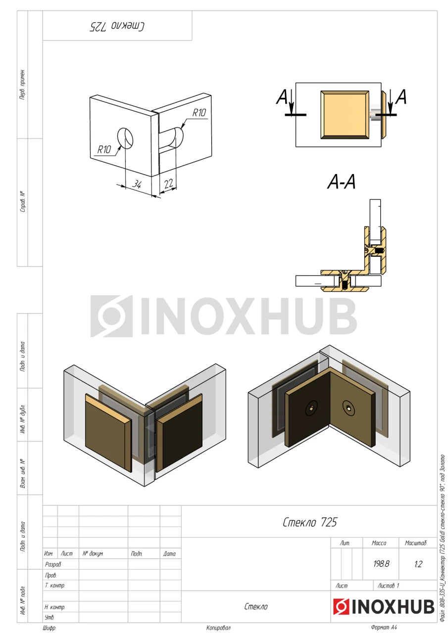 Коннектор (725 Gold) стекло-стекло 90°, под Золото
