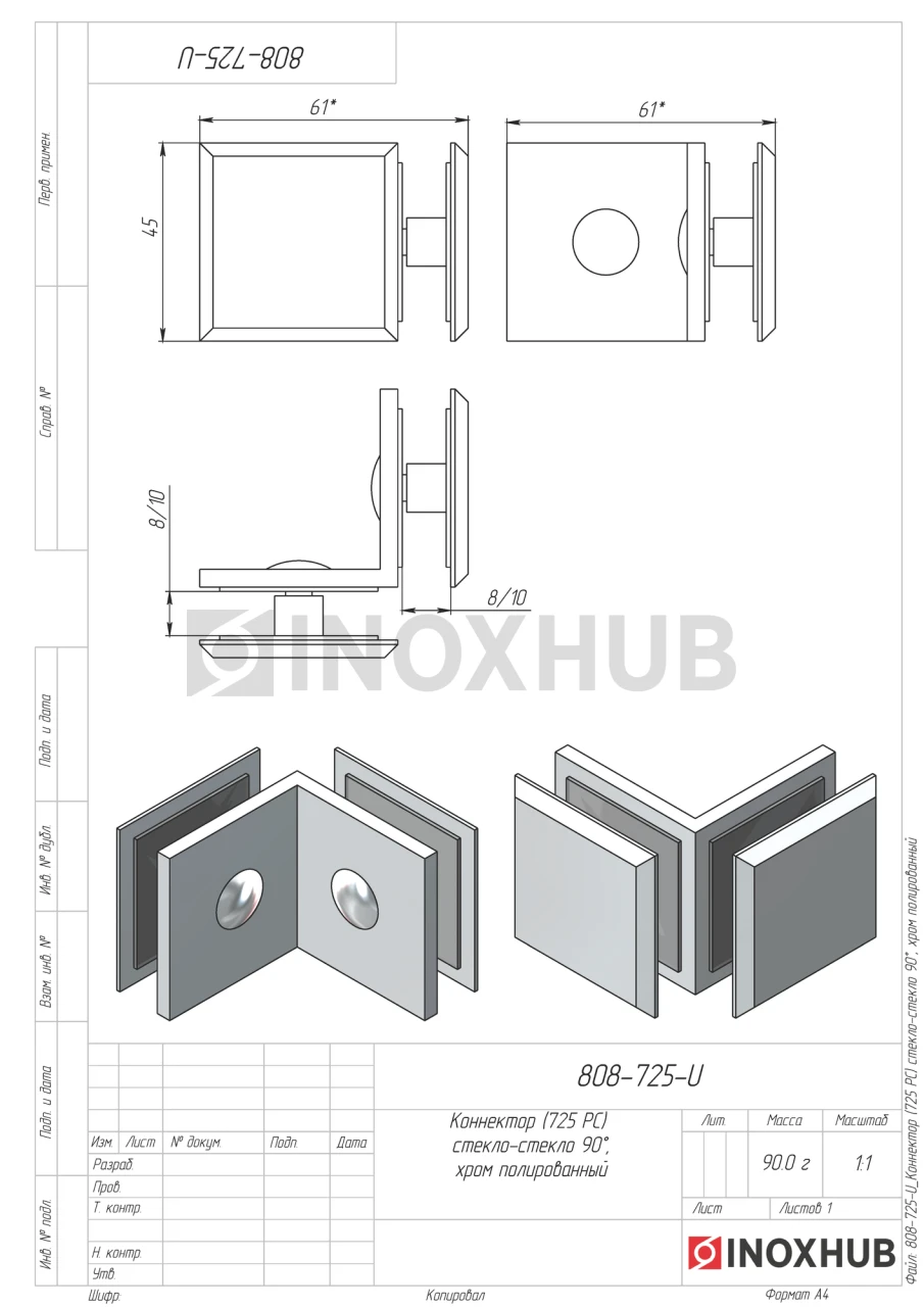 Коннектор (725 PC) стекло-стекло 90°, полированный хром