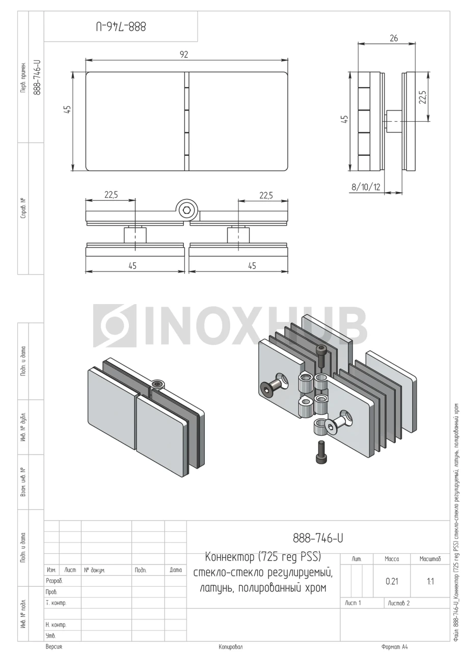 Коннектор (725 reg PSS) стекло-стекло регулируемый, латунь, полированный хром