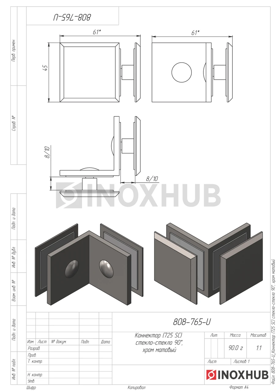 Коннектор (725 SC) стекло-стекло 90°, матовый хром