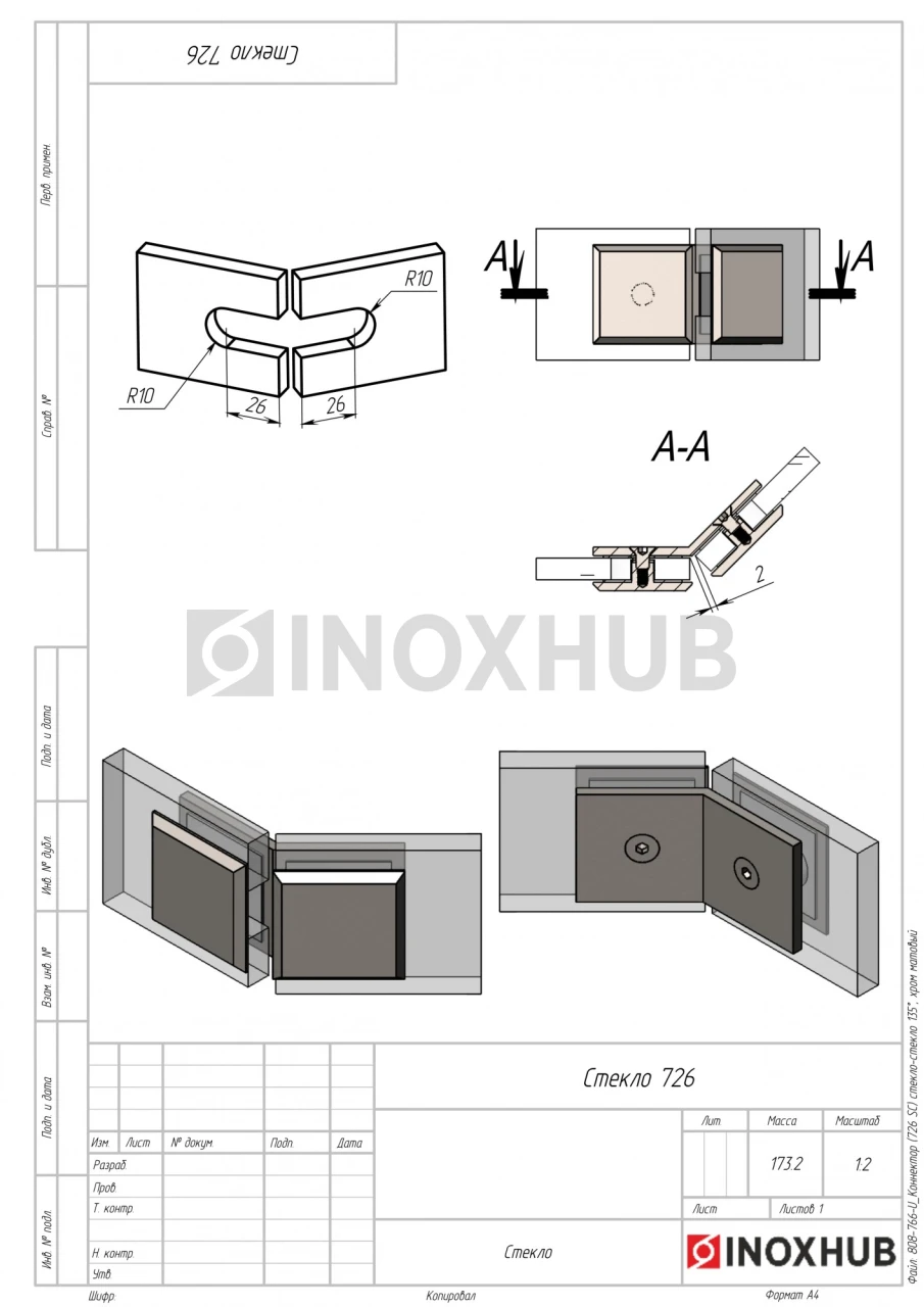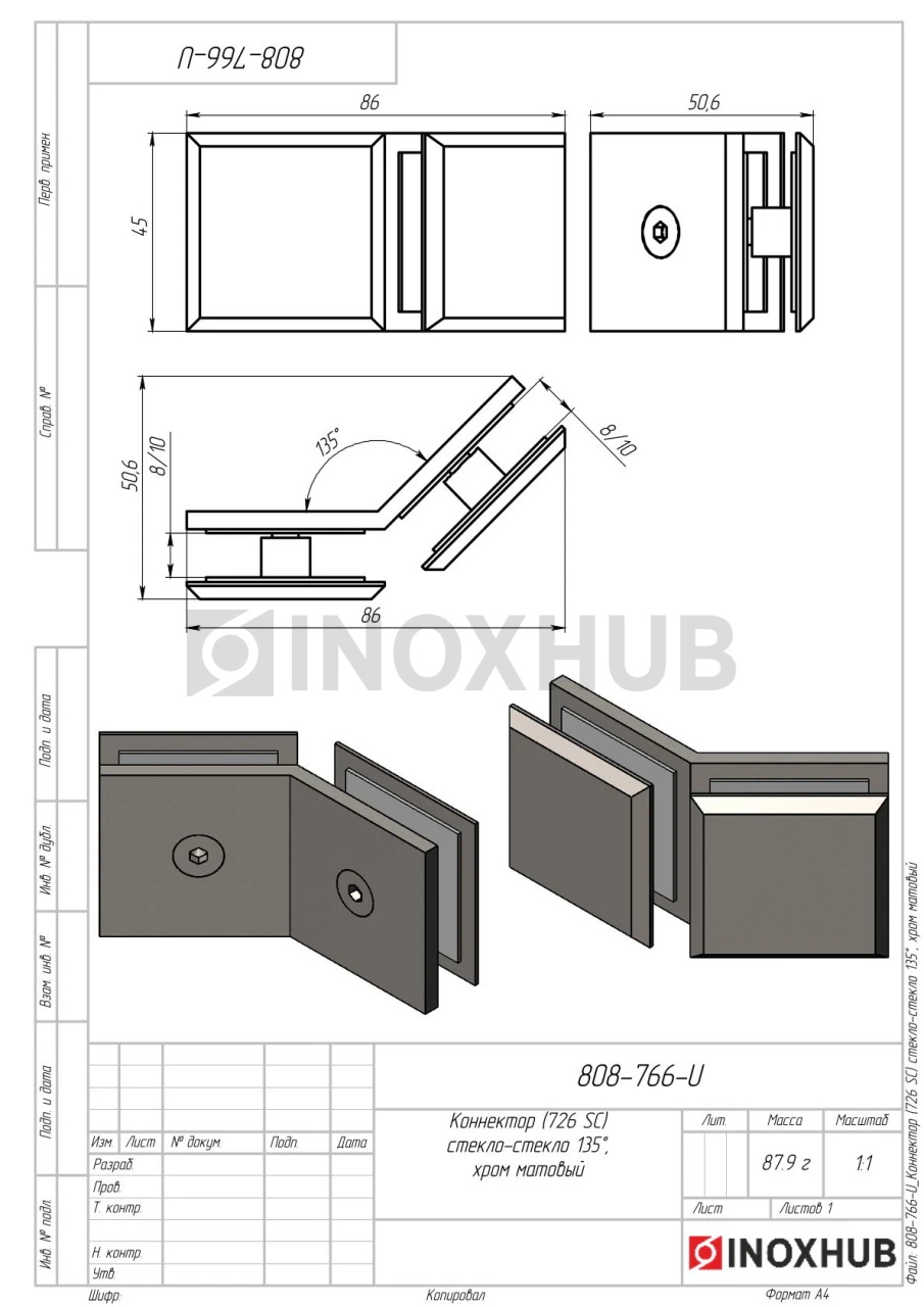 Коннектор (726 SC) стекло-стекло 135°, матовый хром