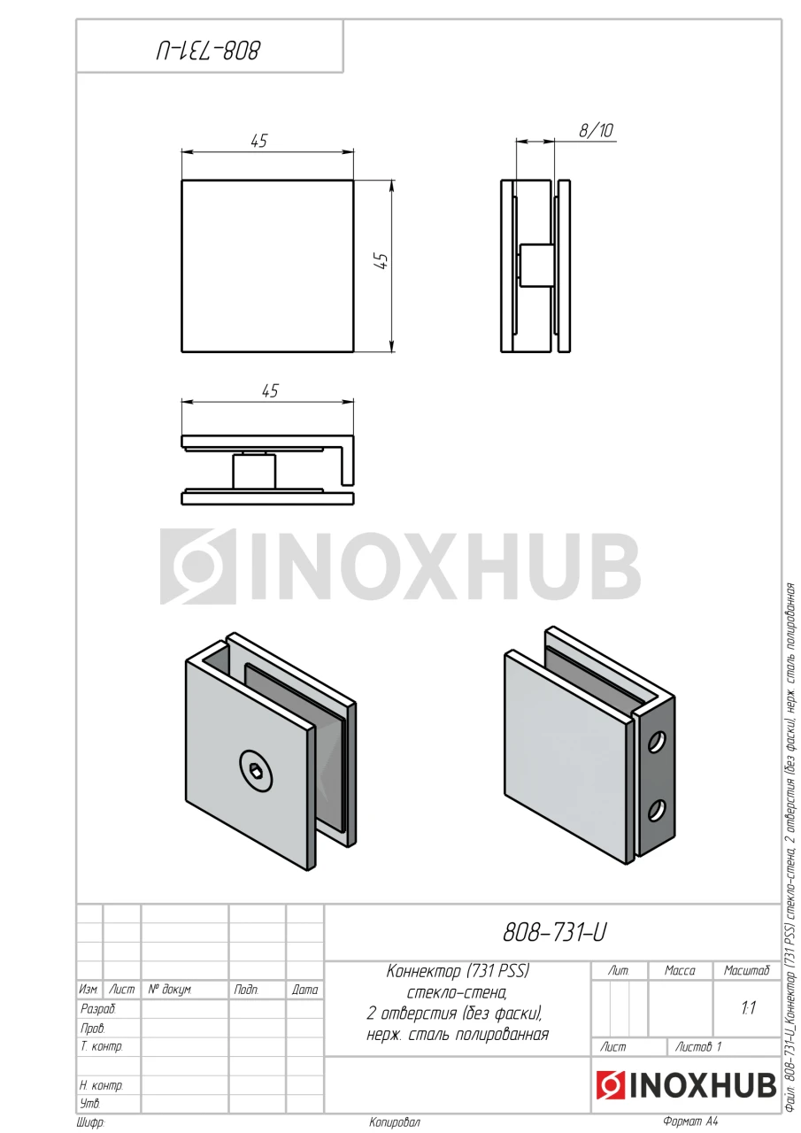Коннектор (731 PSS) стекло-стена, 2 отверстия (без фаски), нерж. сталь полированная