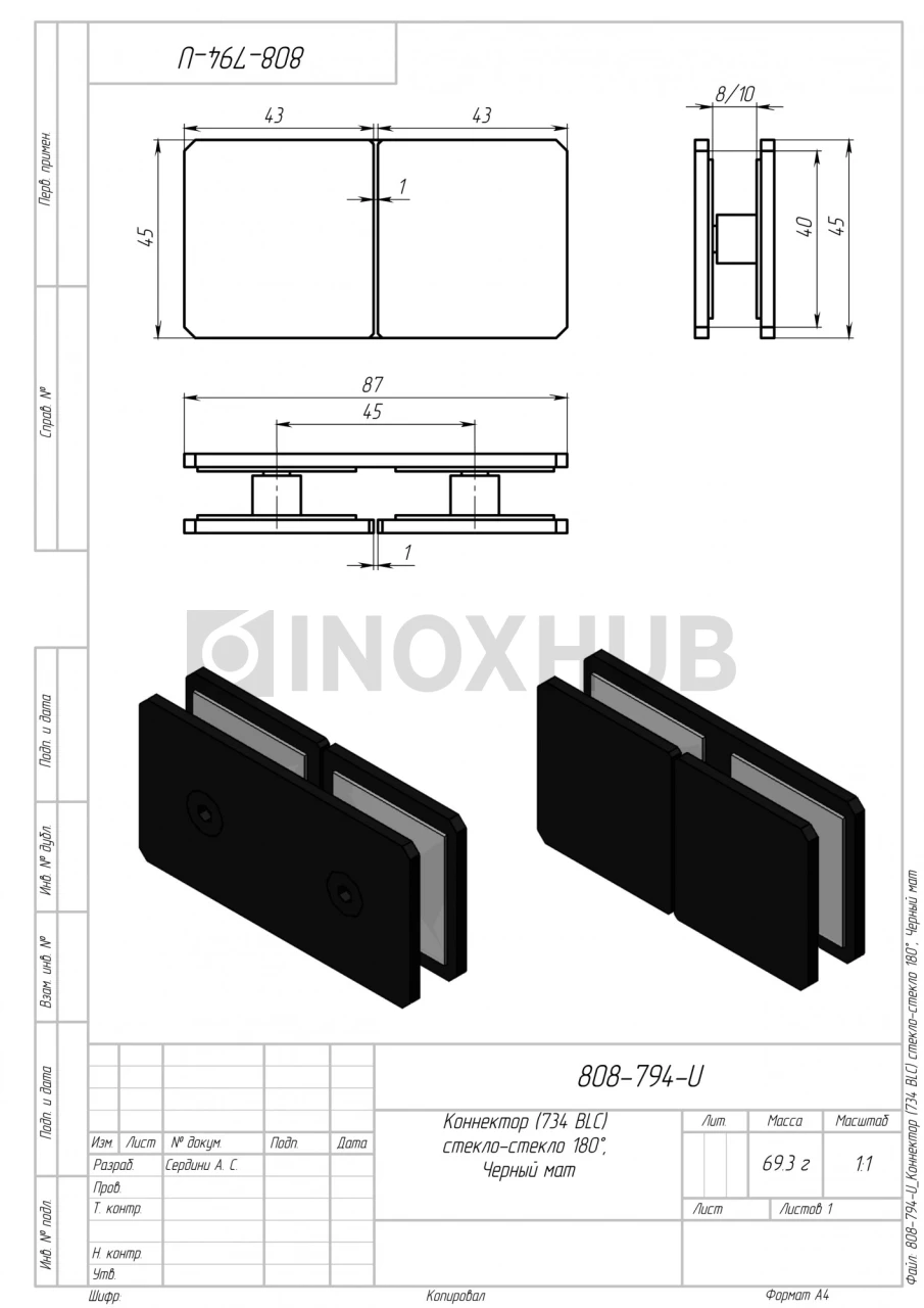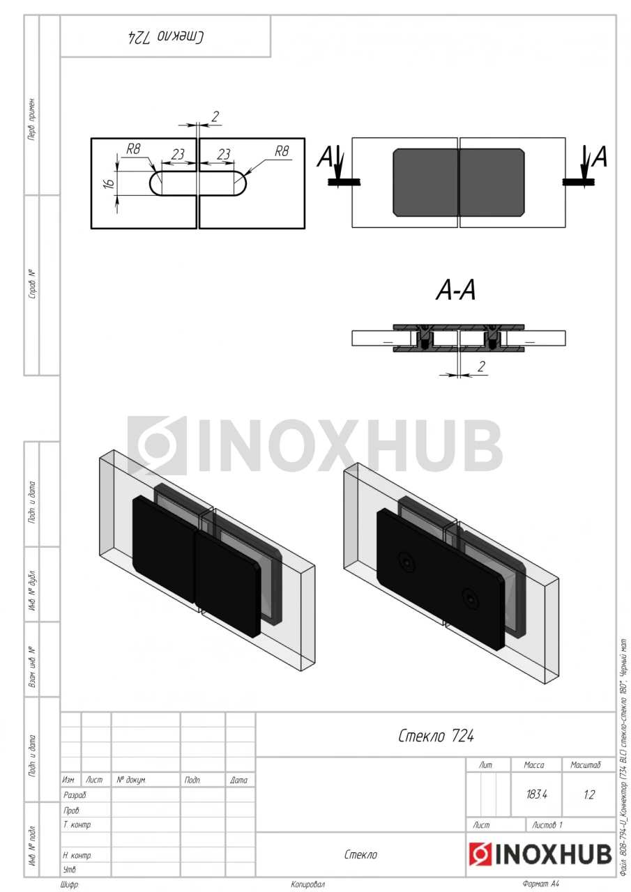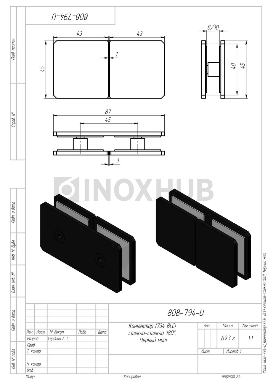 Коннектор (734 BLC) стекло-стекло 180°, Черный мат
