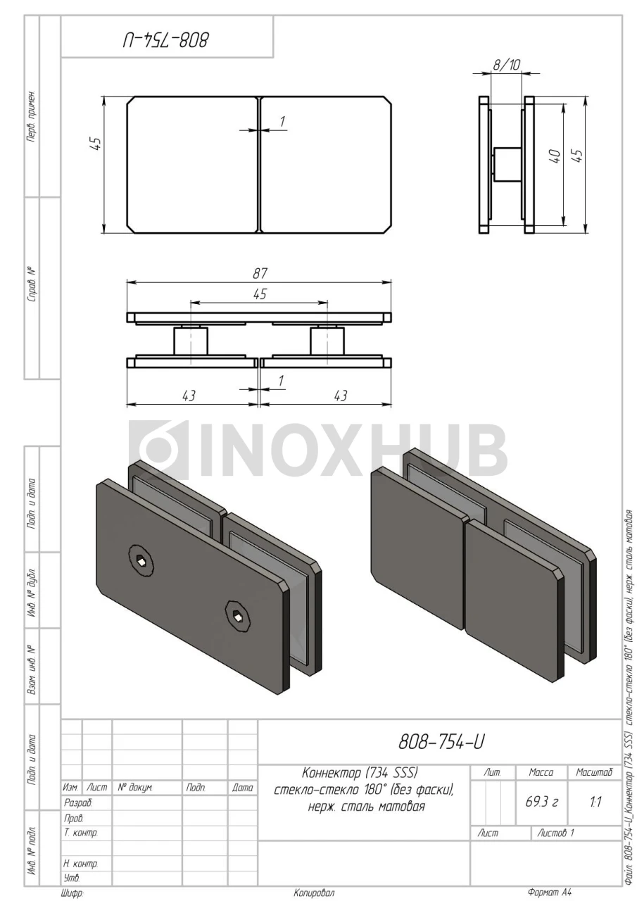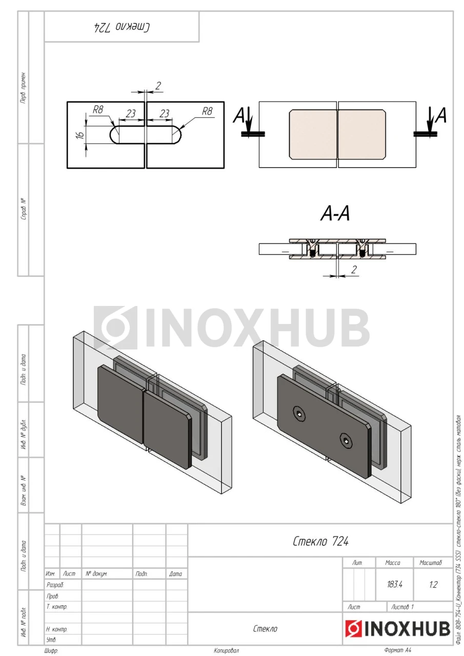 Коннектор (734 SSS) стекло-стекло 180° (без фаски), нерж. сталь матовая
