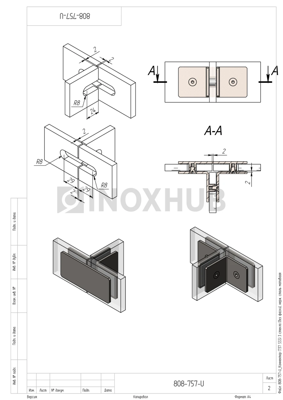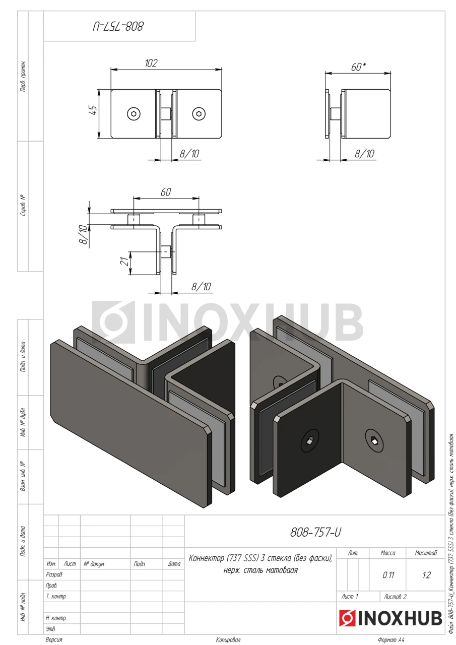 Коннектор (737 SSS) 3 стекла (без фаски), нерж. сталь матовая