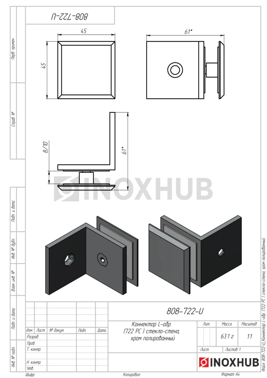 Коннектор L-обр. (722 PС) стекло-стена, полированный хром