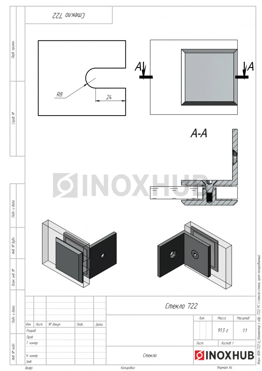 Сборка и монтаж. Перед монтажом необходимо просверлить отверстия в стене и стекле. Элемент состоит из двух частей. L-образная деталь крепится к стене на саморез. Стекло зажимается двумя пластинами с установленными уплотнителями. Детали коннектора скрепляются винтом. Между стеклом и креплением устанавливается уплотнитель.