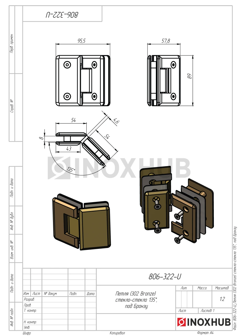Петля (302 Bronze) стекло-стекло 135°, под Бронзу