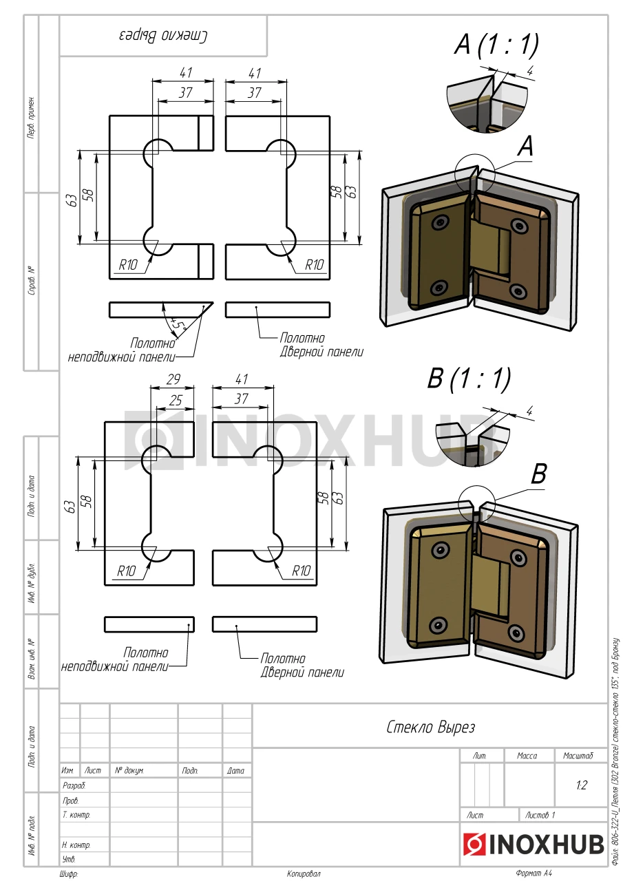 Сборка и монтаж. Перед установкой необходимо подготовить стекло и собрать петлю согласно чертежам и схемам. В комплекте поставляются уплотнители для прочной фиксации стеклянной панели. Стекло зажимается между пластинами петли, которые соединяются двумя шестигранными болтами с каждой стороны. В конструкции заложена система скрытого крепежа.