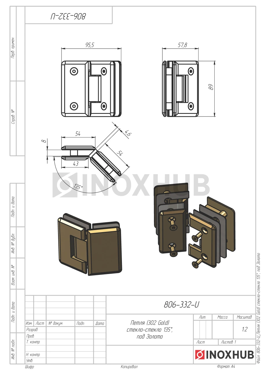 Петля (302 Gold) стекло-стекло 135°, под Золото
