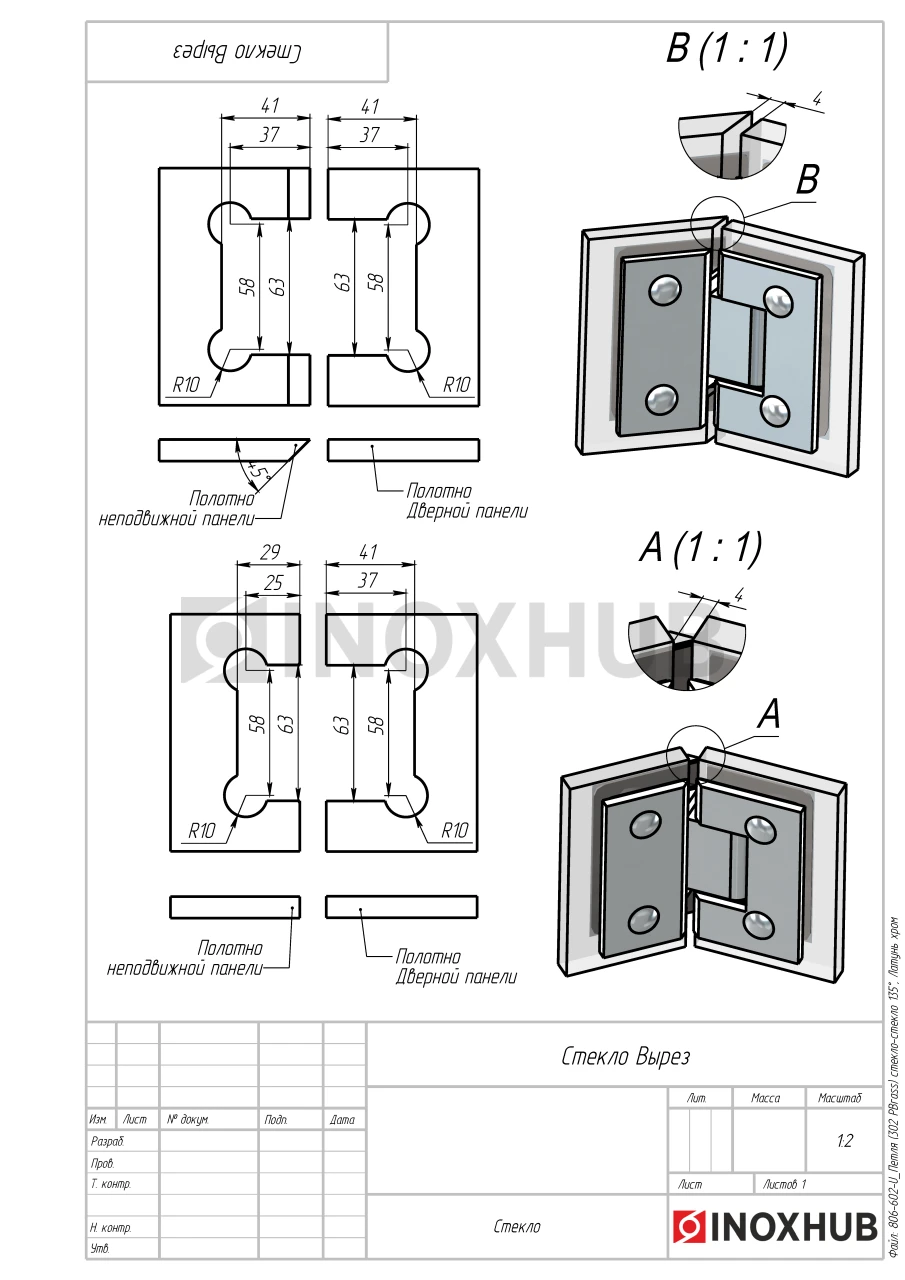 Сборка и монтаж. В комплекте поставляется все необходимое для установки. Для прочной фиксации стекла используются прокладки. Соберите петлю и подготовьте отверстия в стеклопанелях согласно схемам на чертежах.