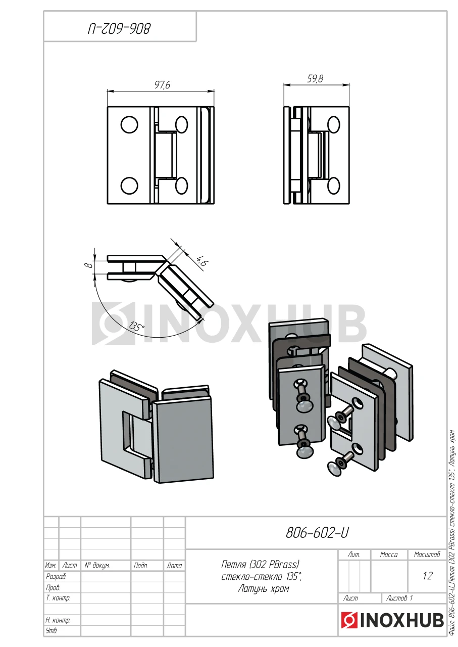 Петля (302 PBrass) стекло-стекло 135° (без фаски), латунь, полированный хром