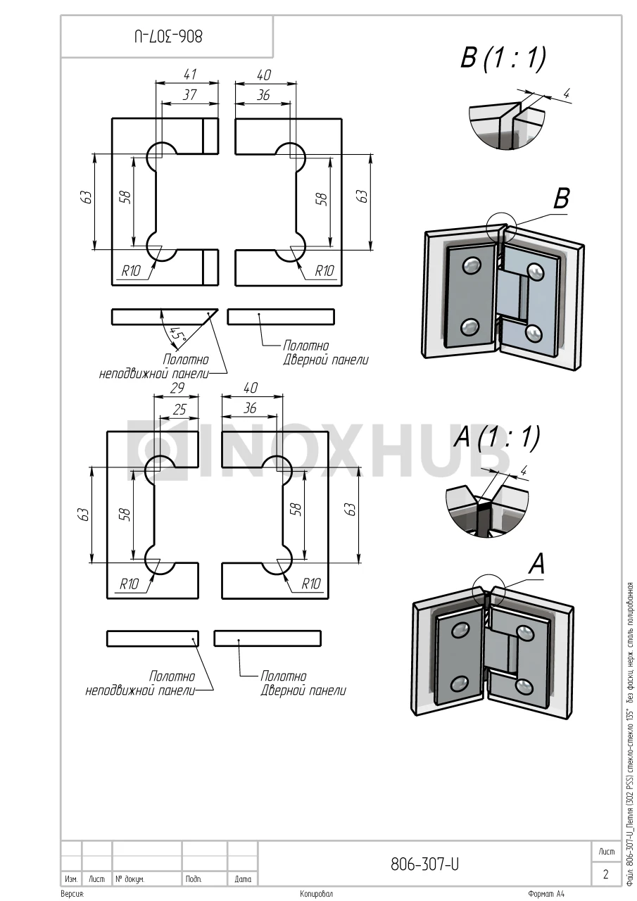 Сборка и монтаж. В комплекте поставляется все необходимое для установки. Петля крепится с обеих сторон на стеклянные модули путем плотного прижатия металлическими зажимами. Для прочной фиксации стекла используются прокладки, которые идут в комплекте. Соберите петлю и подготовьте стеклянные модули согласно схемам на чертежах. Все элементы скрепляются на шестигранные винты по 2 с каждой стороны. На шестигранники предусмотрены заглушки.