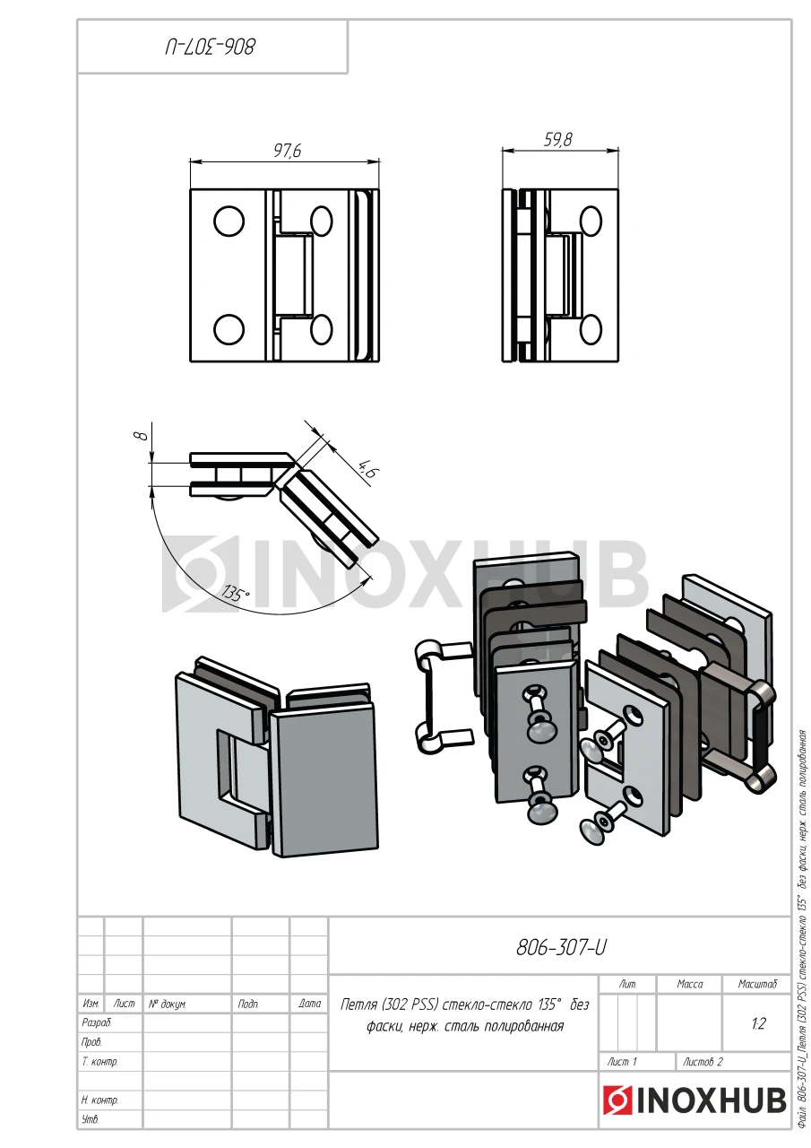 Петля стекло-стекло с максимальным углом открытия 135º изготовлена из нержавеющей стали AISI 304. Изделие обладает высокой механической прочностью, стойкостью к коррозии, температурным перепадам и моющим средствам. Поверхность полированная с глянцевым блеском.