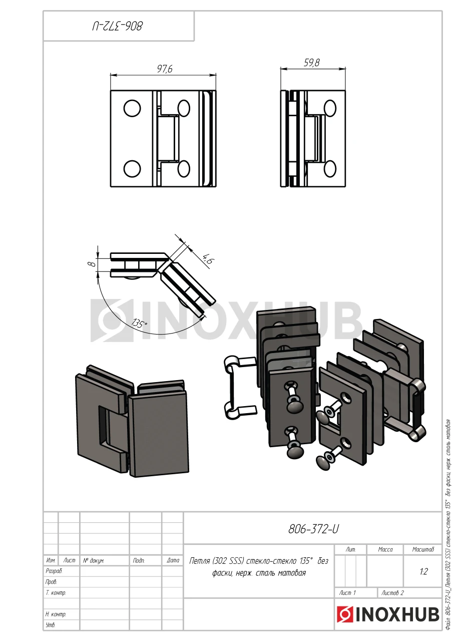 Петля (302 SSS) стекло-стекло 135° (без фаски), нерж. сталь матовая
