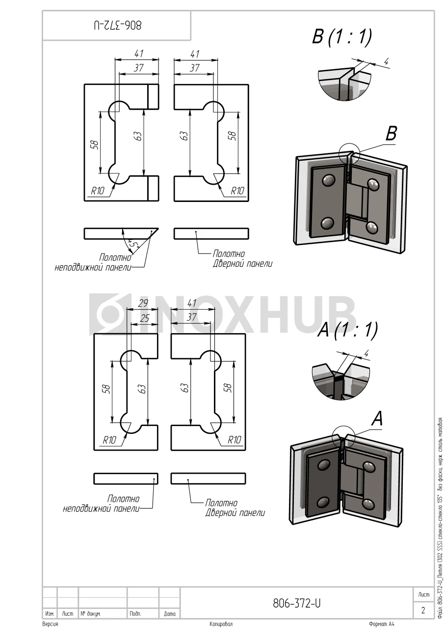 Сборка и монтаж. Перед установкой необходимо подготовить стекло и собрать петлю согласно чертежам и схемам. В комплекте поставляются прокладки для прочной фиксации стеклопанели. Стекло зажимается между пластинами петли, которые соединяются двумя шестигранными болтами с каждой стороны. В конструкции заложена система скрытого крепежа, в комплекте поставляются заглушки для болтов.