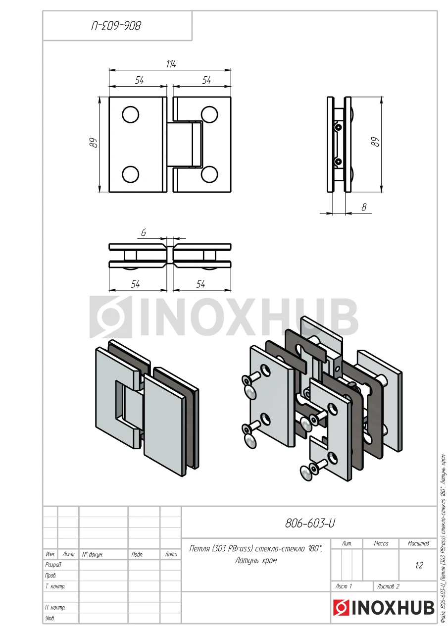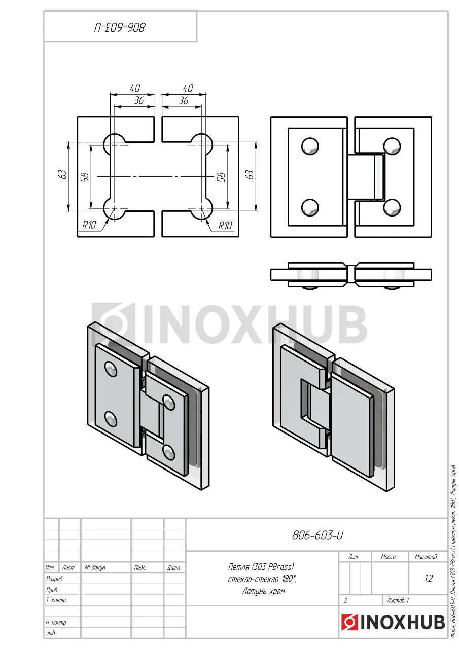Петля (303 PBrass) стекло-стекло 180°, (без фаски), латунь, полированный хром