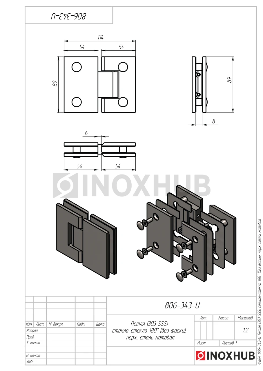 Петля (303 SSS) стекло-стекло 180° (без фаски), нерж. сталь матовая