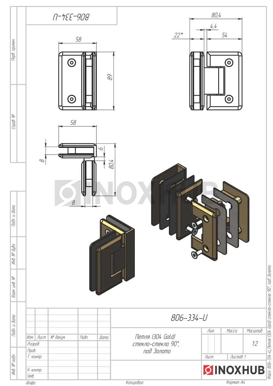 Петля (304 Gold) стекло-стекло 90°, под Золото
