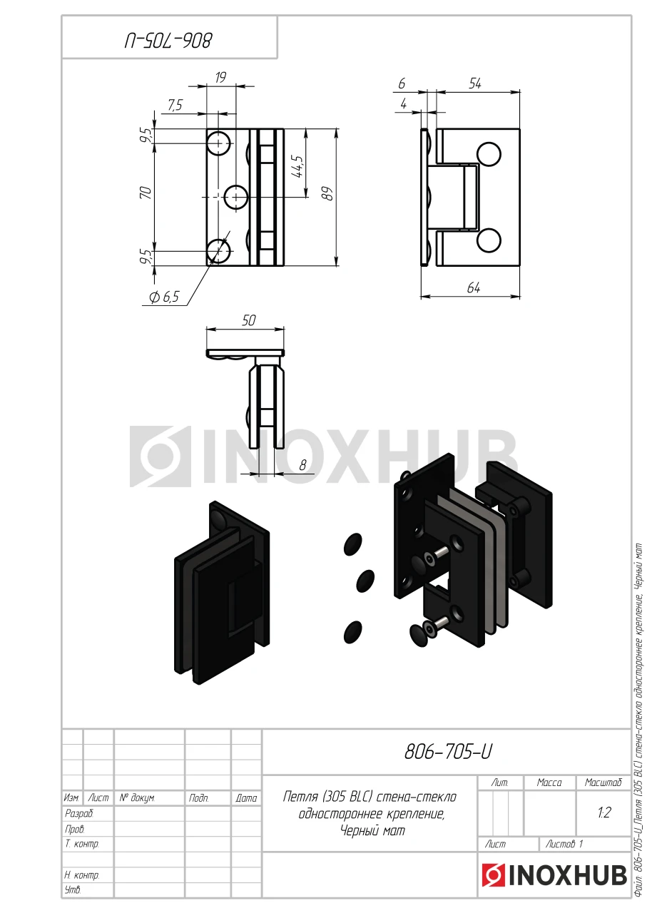 Петля (305 BLC) стена-стекло одностороннее крепление, нерж. сталь Черный мат