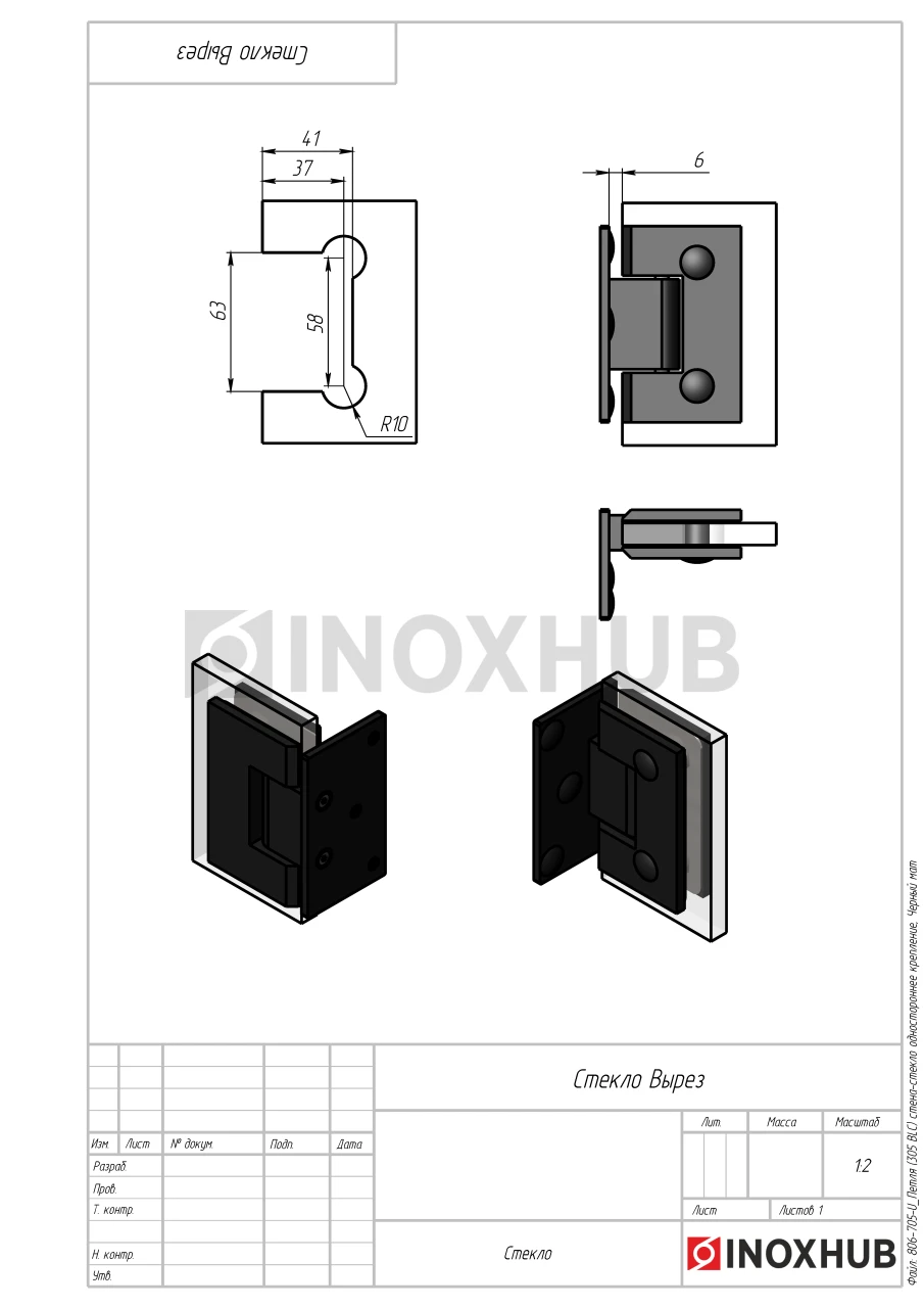 Петля стена-стекло без фаски изготовлена из нержавеющей стали AISI 304. Изделие обладает высокой механической прочностью, устойчивостью к коррозии, температурным перепадам, моющим средствам. Матовое черное покрытие на металле не стирается со временем, устойчиво к воздействию влаги, обладает антикоррозийными свойствами.